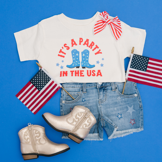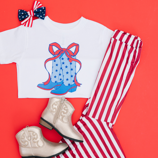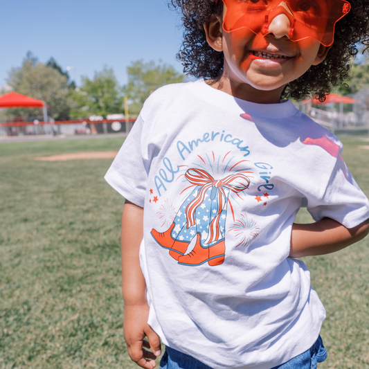 Girls 4th Of July AMERICAN Boots Print Coral Cotton T-shirt