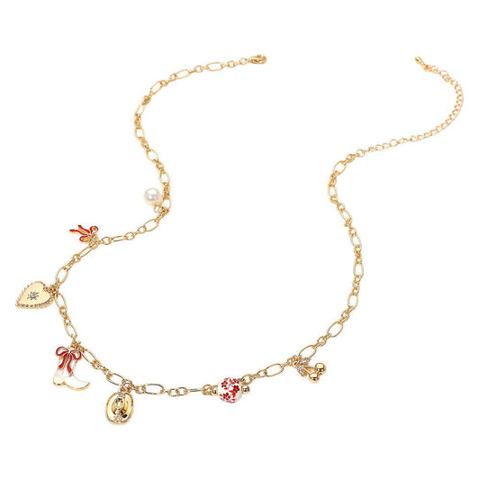 Enamel Bow Western Cowboy Boot Hat Heart Ceramic Ball Pearl Cherry Charm Station Necklace