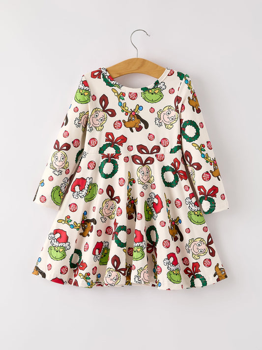 Winter Christmas Tree Bow Character Print Green Girls Dress