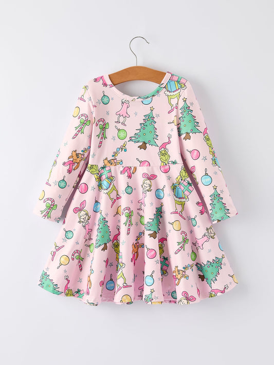 Pink Christmas Character Print Long Sleeve Girls Dress