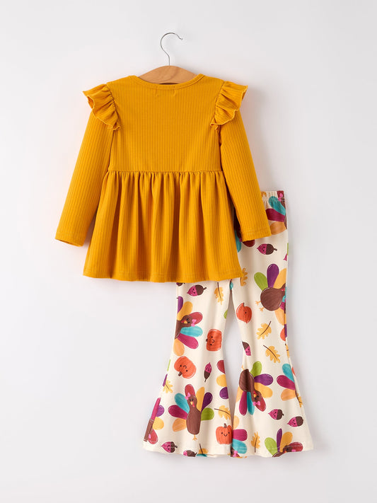 Fall Halloween & Thanksgiving Pumpkin Turkey Print Girls Long Sleeve Set