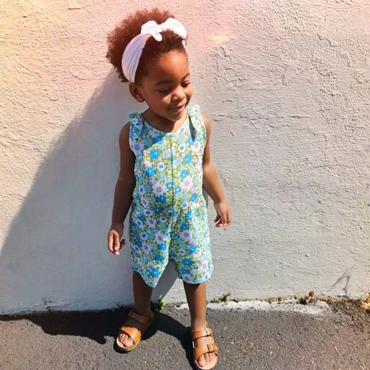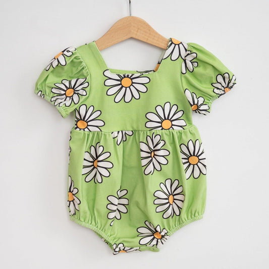 Green and Blue Flower Power Double Gauze Romper for Babies and Toddler Girls