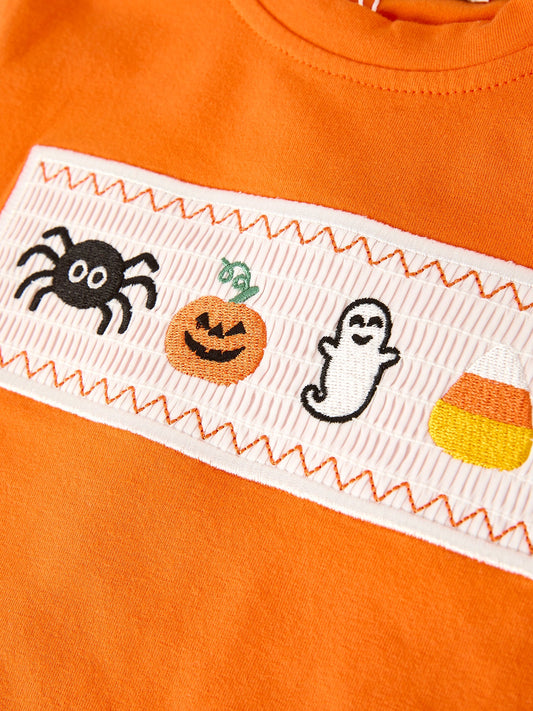 Fall Halloween Orange Pumpkin Ghost Spider Smock Embroidery Boy Set