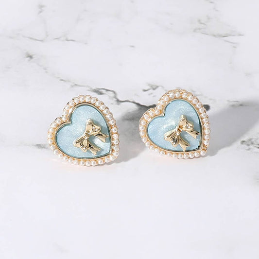 Pearl Paved Rim Metal Bow Pointed Enamel Heart Stud Earrings