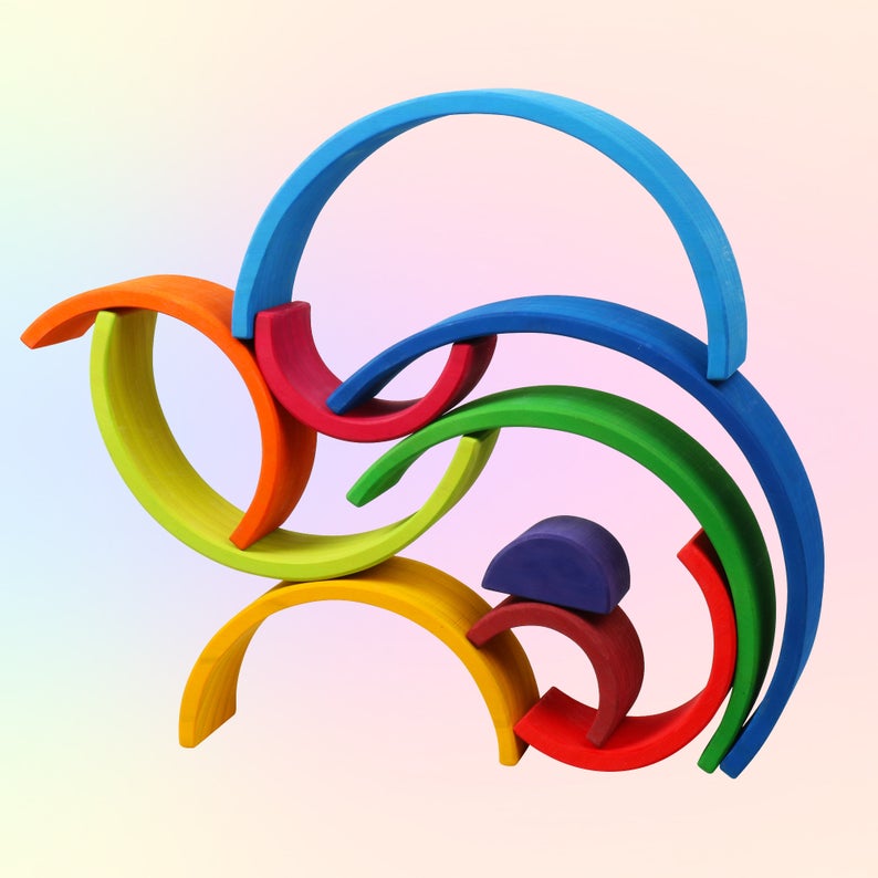 This 10-piece Stained Wooden Rainbow Stacking Puzzle in soft sunset hues adds warmth and creativity to any playroom.