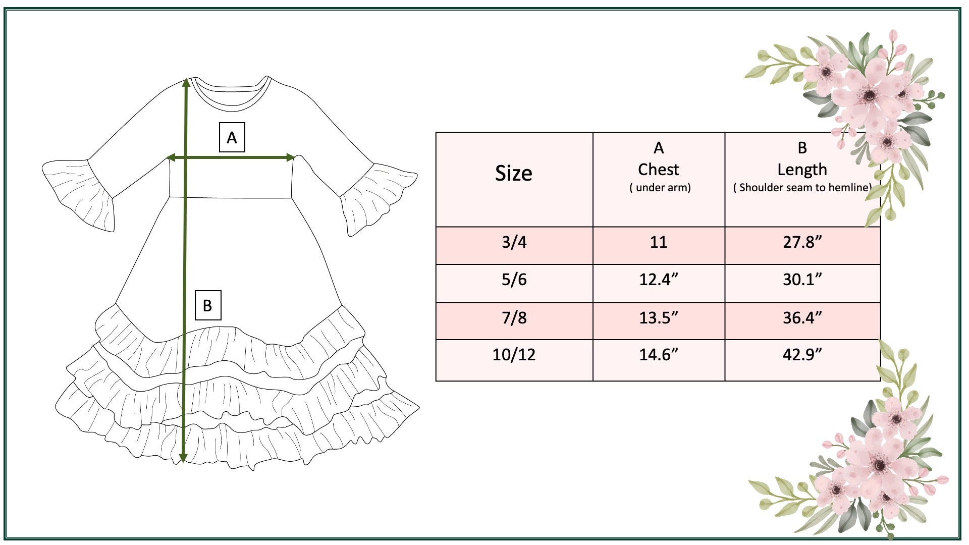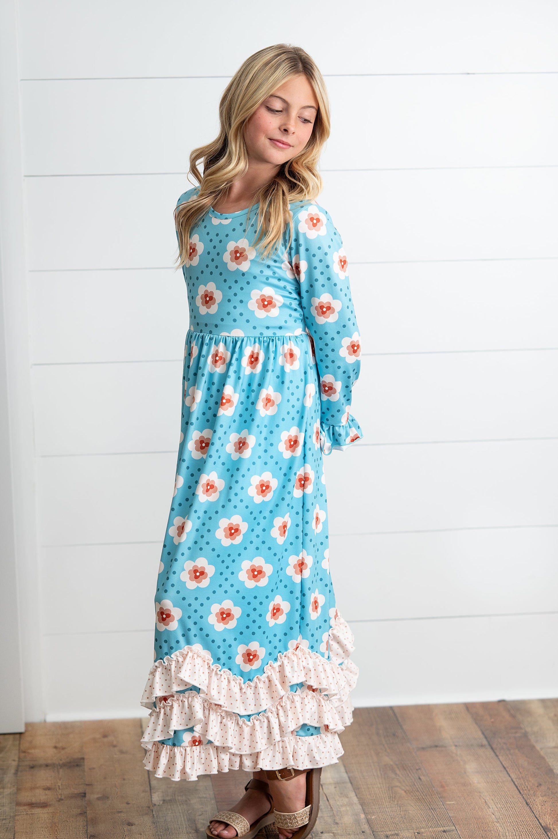 This playful teal dress for girls features a charming dot and flower print with three delightful ruffles and long sleeves. Perfect for back-to-school days, it’s designed for twirling fun and everyday comfort.