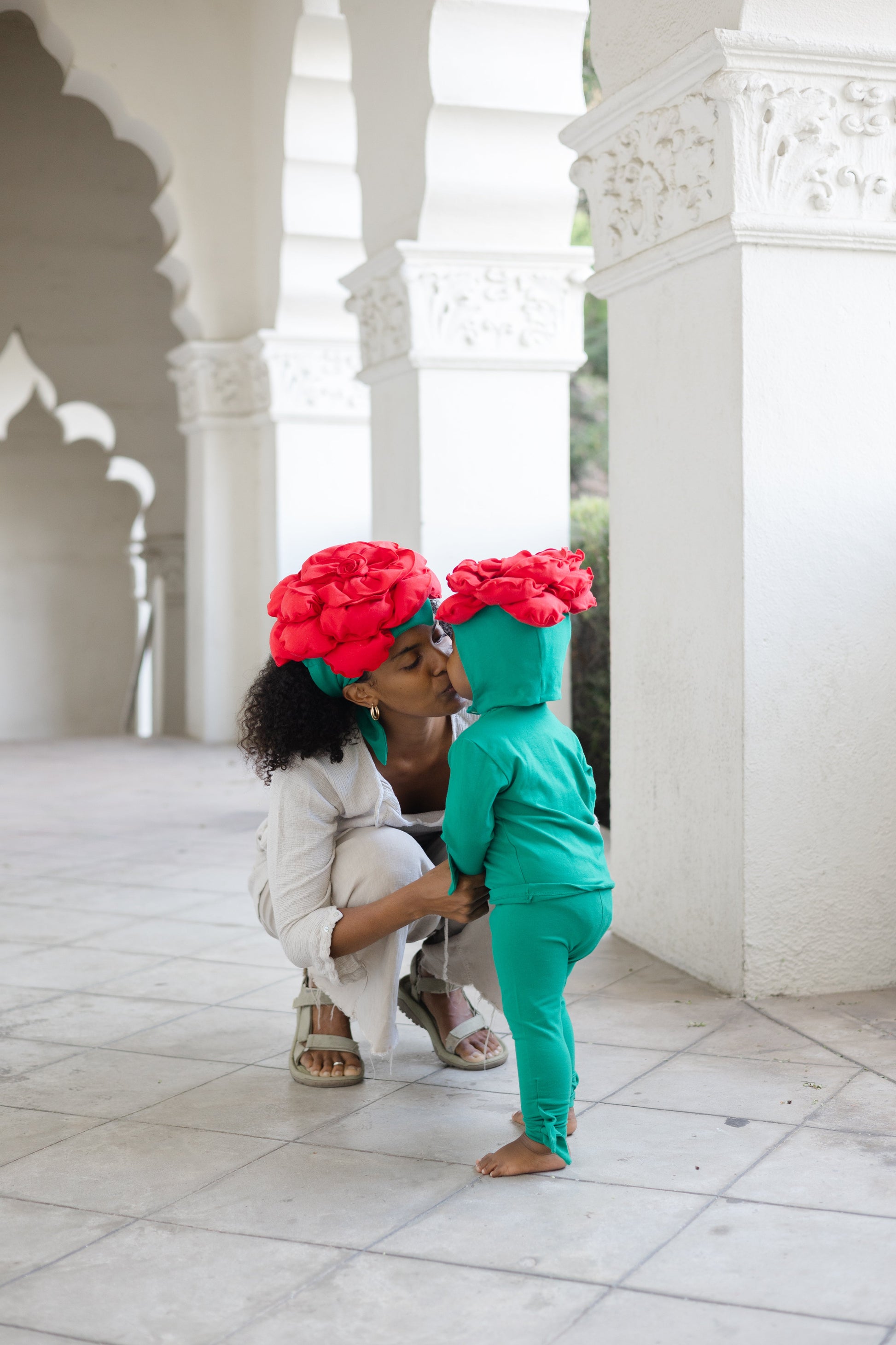 This elegant hand crafted rose hat for women is perfect for creating a chic mommy-and-me costume look. Designed in a flattering turban style, it features soft and ties with stretch under the hair, ensuring a comfortable and secure fit. The striking bloom on top gives it a whimsical fairy look, making you the loveliest rose in the garden. Ideal for coordinating with your little one’s matching costume, it’s a creative and eye-catching way to celebrate together. Whether you’re trick-or-treating or attending a party, this hat adds a dash of whimsy to your Halloween look.