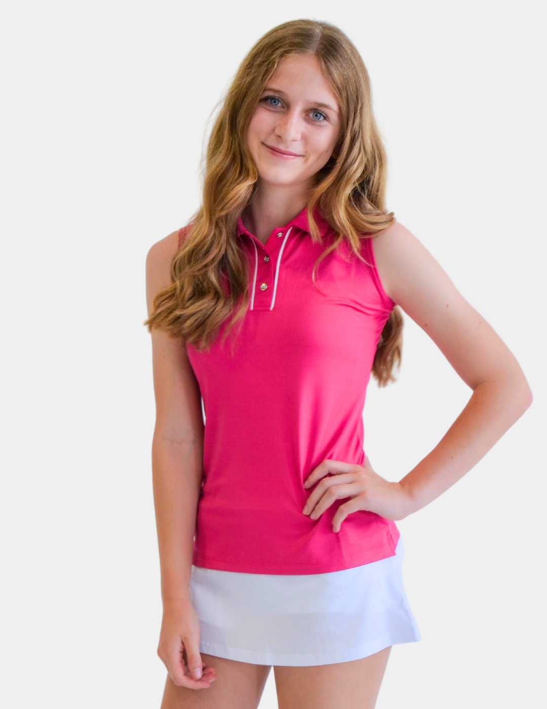 Ansley is a solid, sleeveless girls junior golf polo with white trim on the collar. Ansley is perfect for those hot summer days on the course, you will be sure to look cute and stay cool. Pairs well with any skort or favorite bottoms.