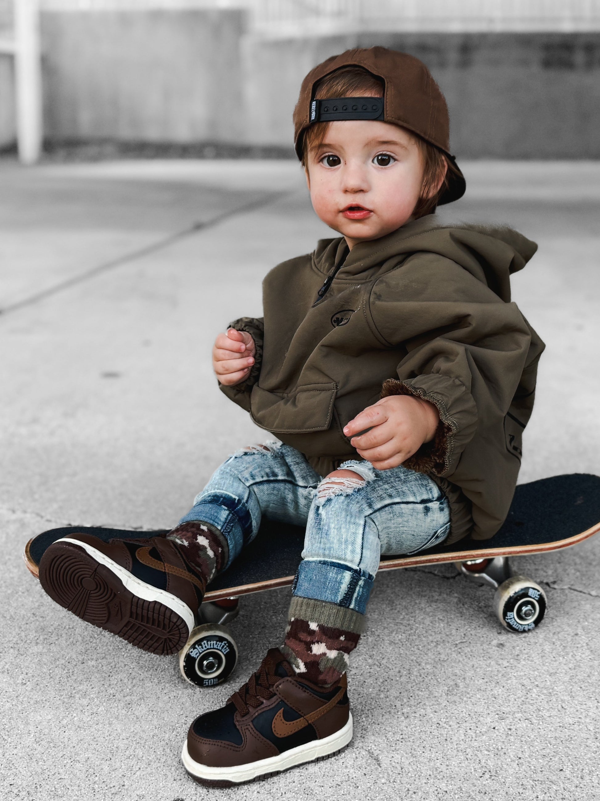 Sizes Infant, Extra Small, Small, Medium have logo grips on the bottom of the feet large have a stitched logo on the bottom of the feet.