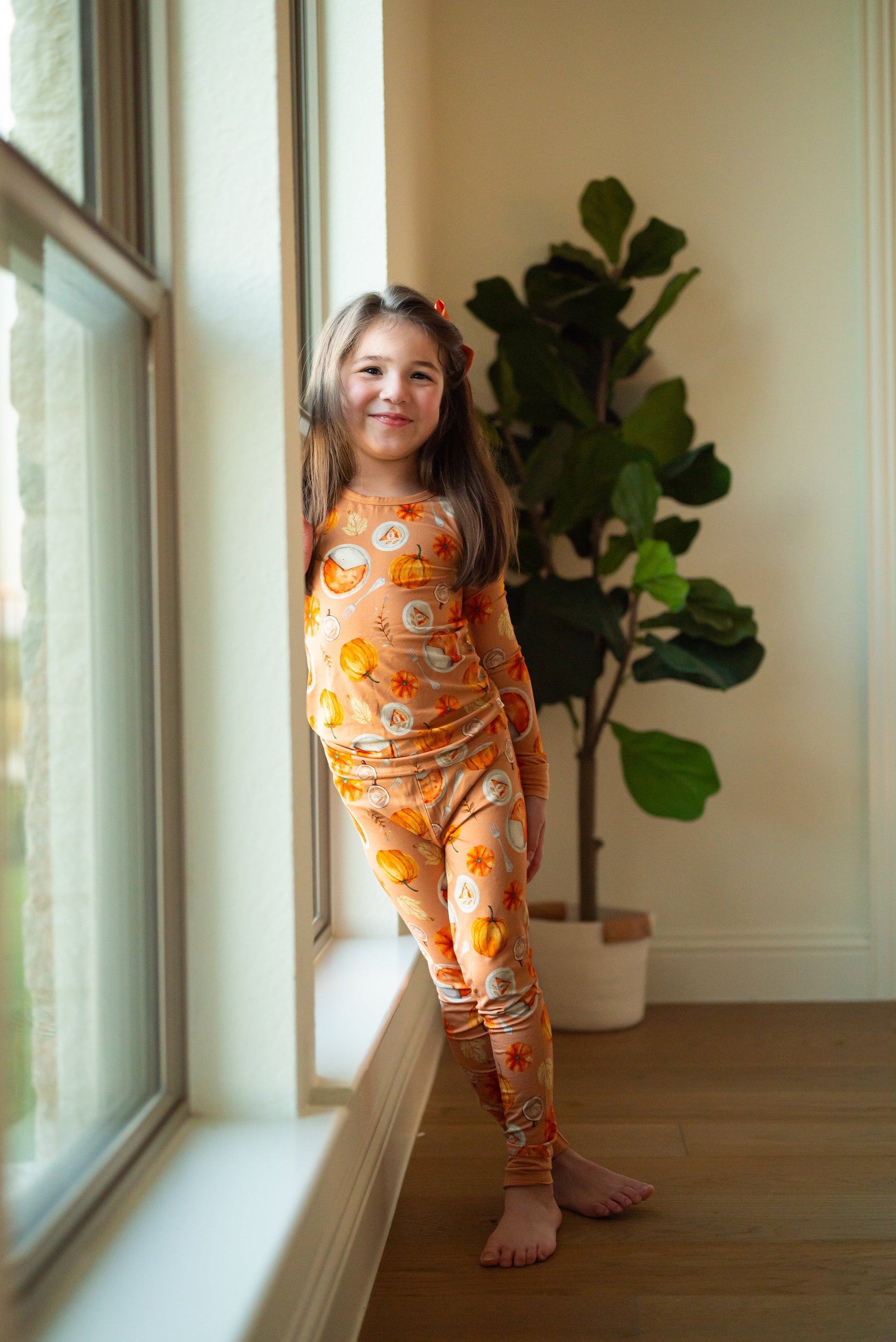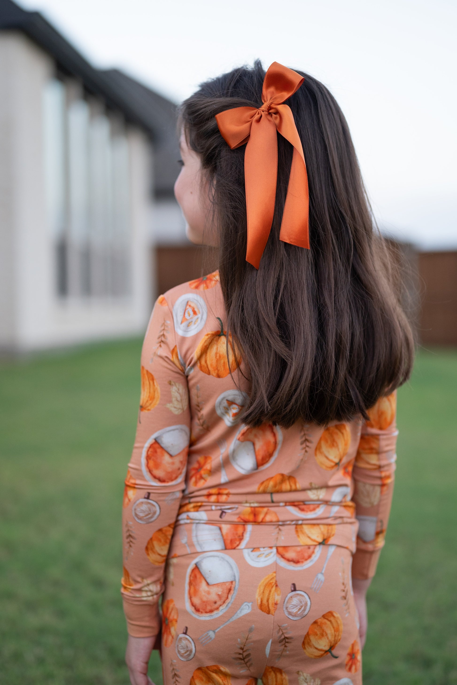 Our At the Table print is perfect for your Thanksgiving festivities. Enjoy your pumpkin pie and autumn favorites in our comfortable long sleeve lounge set. Featuring a festive pumpkin pie design and celebrates the warmth of fall. Stay comfortable and stylish at the table and while lounging around.
