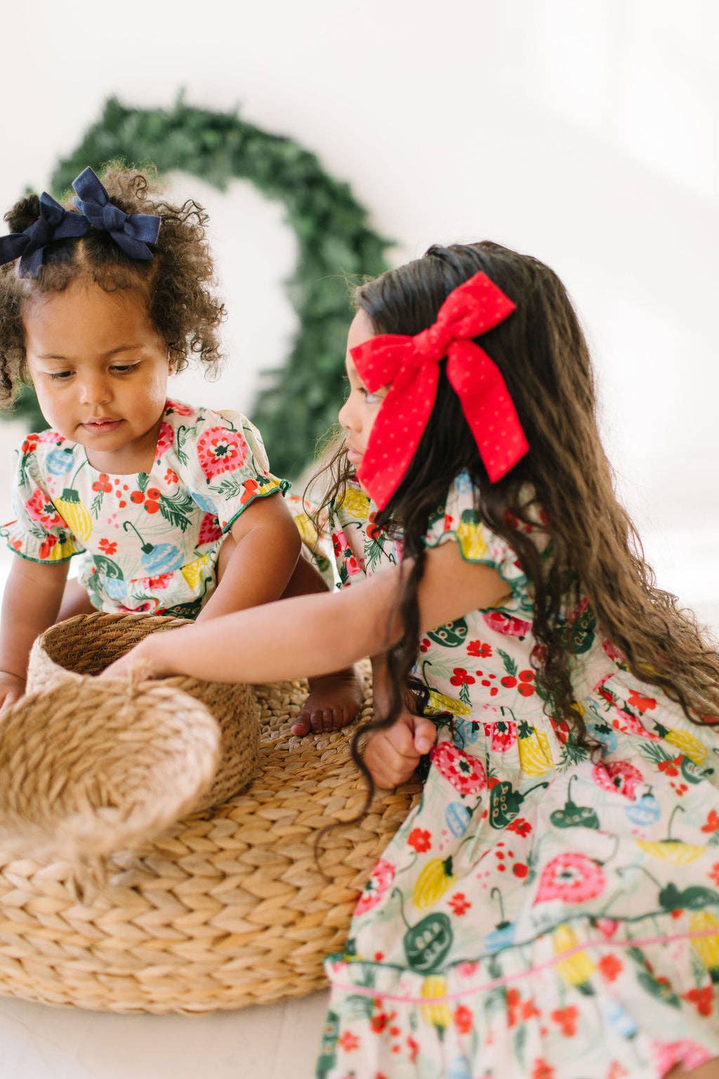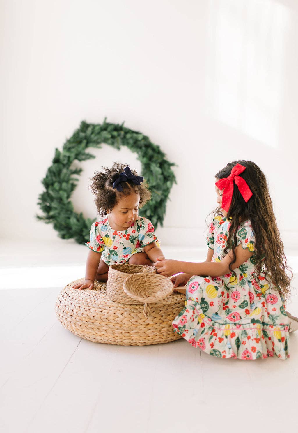 Our Aura Dress features a puffed short sleeve with a ruffled arm opening detail and a full skirt with trim and a sweet ruffle as well as a zippered back made of 100% poplin cotton with a cotton liner.