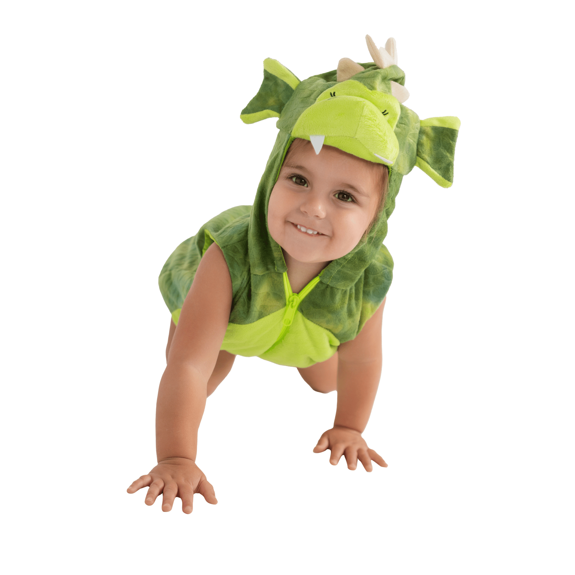 ADORABLE BABY DRAGON COSTUME: Transform your little one into a mythical creature with this charming baby dragon costume featuring a vibrant green color and scaly texture for a magical look. Your little one will steal the show with these adorable and detailed features. The romper showcases a delightful two-tone design, with a darker green scaly body and a lighter green belly, creating a captivating and eye-catching appearance for your baby dragon. The hood is the highlight of this costume, complete with dragon horns, fangs, ears, and a charming face.