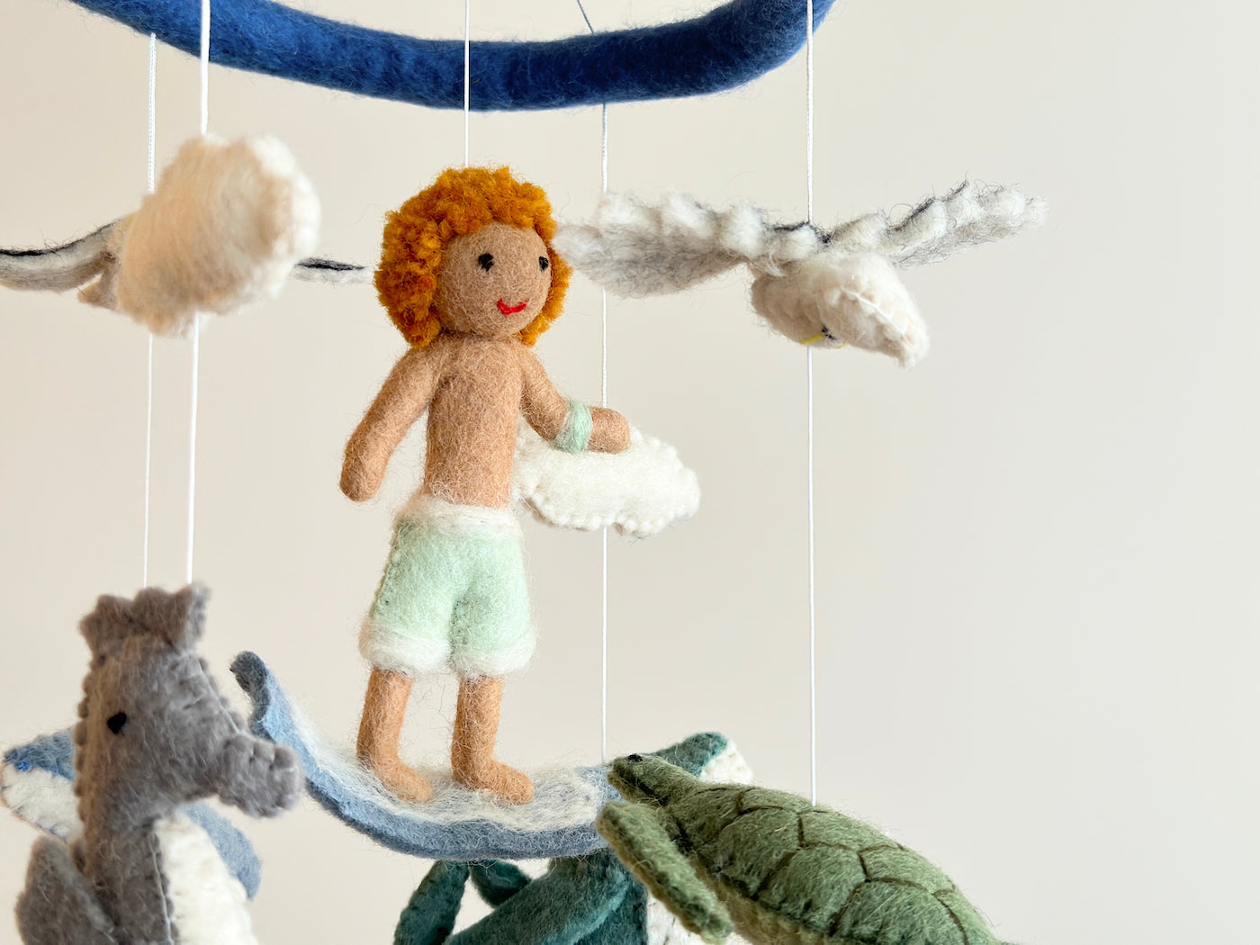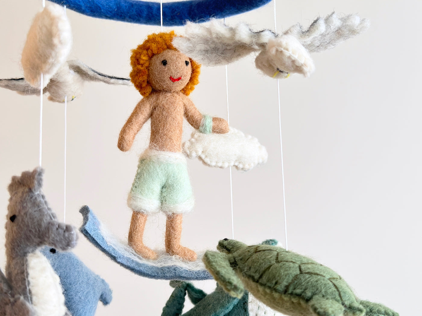Introduce your little one to the magic of the ocean with our Baby Mobile - Surfer Boy. Watch as surfer boy, sea turtles, sea horses, whales, dolphins, and a seagull cloud dance above your baby's crib, creating a peaceful and enchanting environment. Meticulously crafted, this mobile captures the beauty of marine life and adds a touch of whimsy to any nursery. Transform the space into an underwater haven for your little surfer!