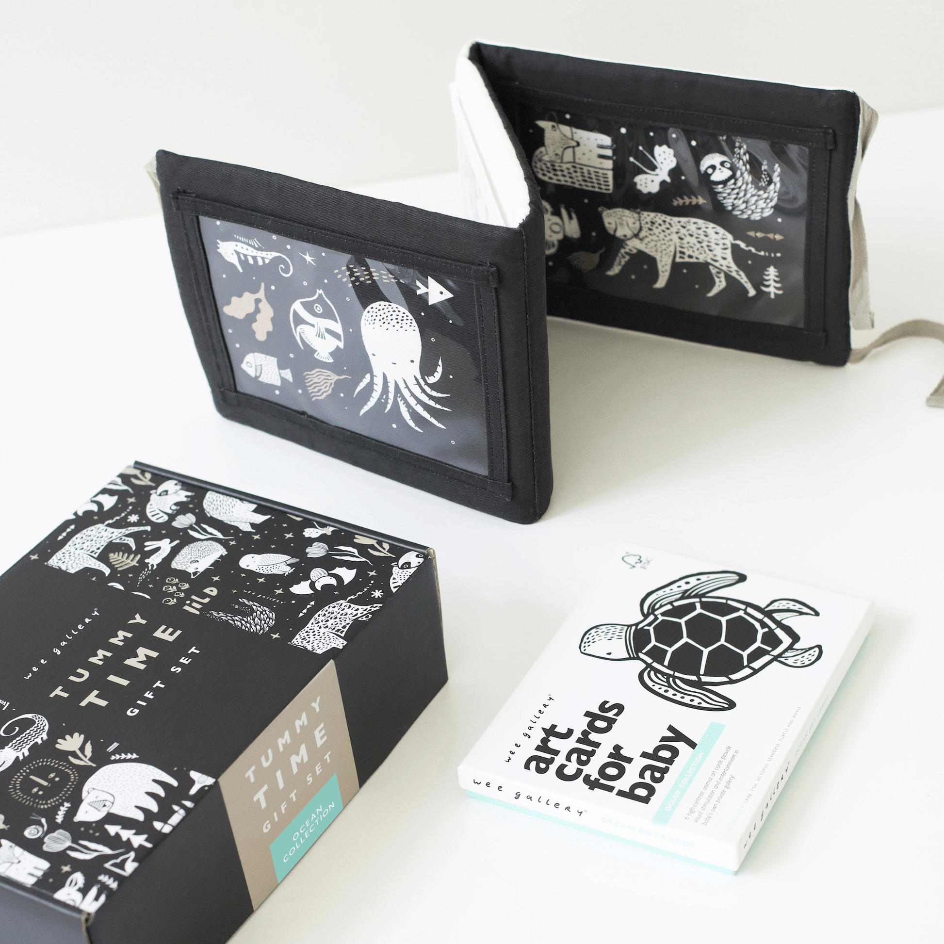 The Tummy Time Gift Set pairs together our best-selling Tummy Time Gallery and your choice of Art Cards for Baby — all in a beautiful custom gift box! The reversible Tummy Time Gallery space has many opportunities for stimulation. Illustrated graphics, embroidered features, and pockets for the included Wee Gallery 5x7 inch Art Cards. Select the design of Art Cards that you would like to pair with your Tummy Time Gallery to create your own special gift set.