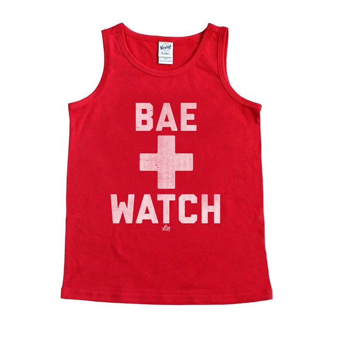 Bae Watch, emphasis on the “BAE”, or “before anyone else”, is any activity by your little ones condoning the search of their Mama or Dada in public, especially the beach. Shop the new exclusively designed Bae Watch kids tank from Ledger Nash Co.