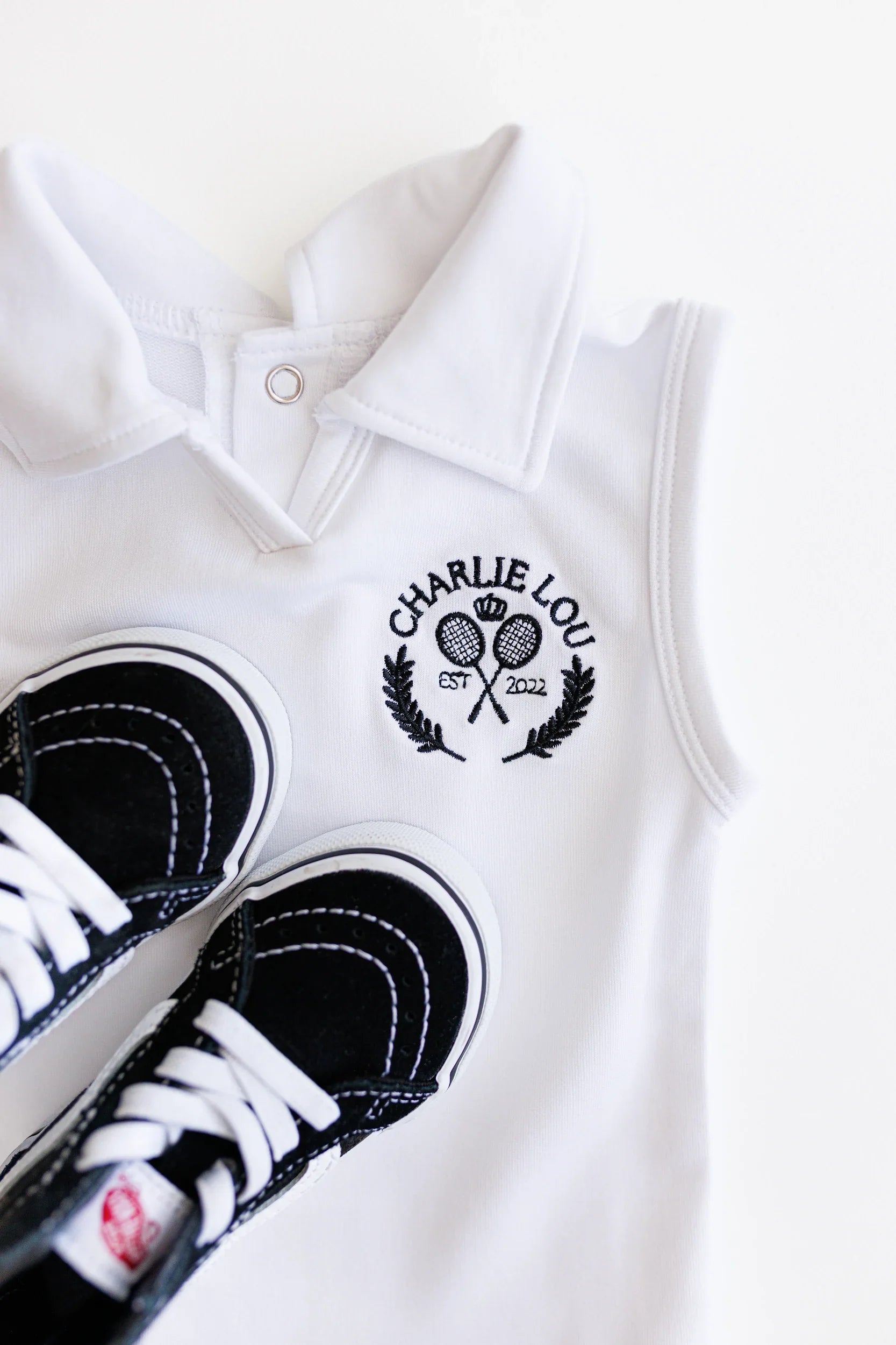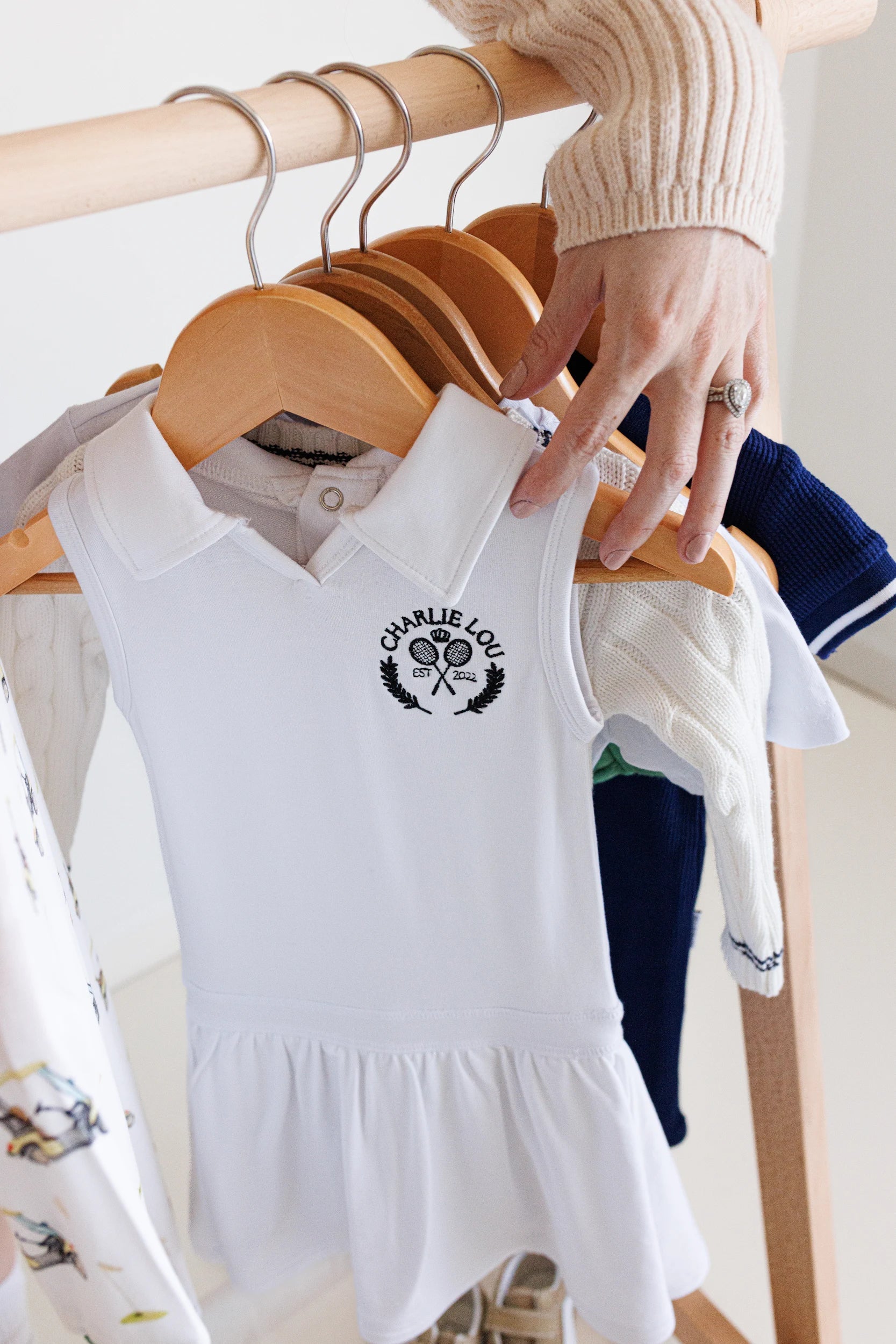 Experience the perfect fusion of comfort and style with our adorable Tennis Dress, crafted from luxurious 350GSM bamboo fabric. Ideal for active play both on and off the tennis court, this dress offers unmatched softness and durability, with a lightweight and breathable fabric that feels gentle against delicate skin. Designed to accommodate growing children, the dress features a bodysuit with snaps for easy diaper changes in smaller sizes, while the larger sizes offer a chic, sporty look. Its classic collar, high-rise V-neck, and tank top sleeves ensure your little one stands out as a stylish trendsetter, making it a cherished addition to their wardrobe.