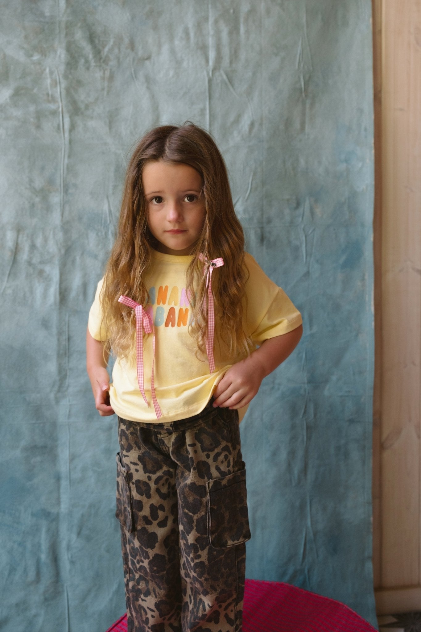 Everly (brunette) is 4 & 41" tall and wearing 3–5Y with plaid pants, and 2/3T with leopard jeans for a cropped look