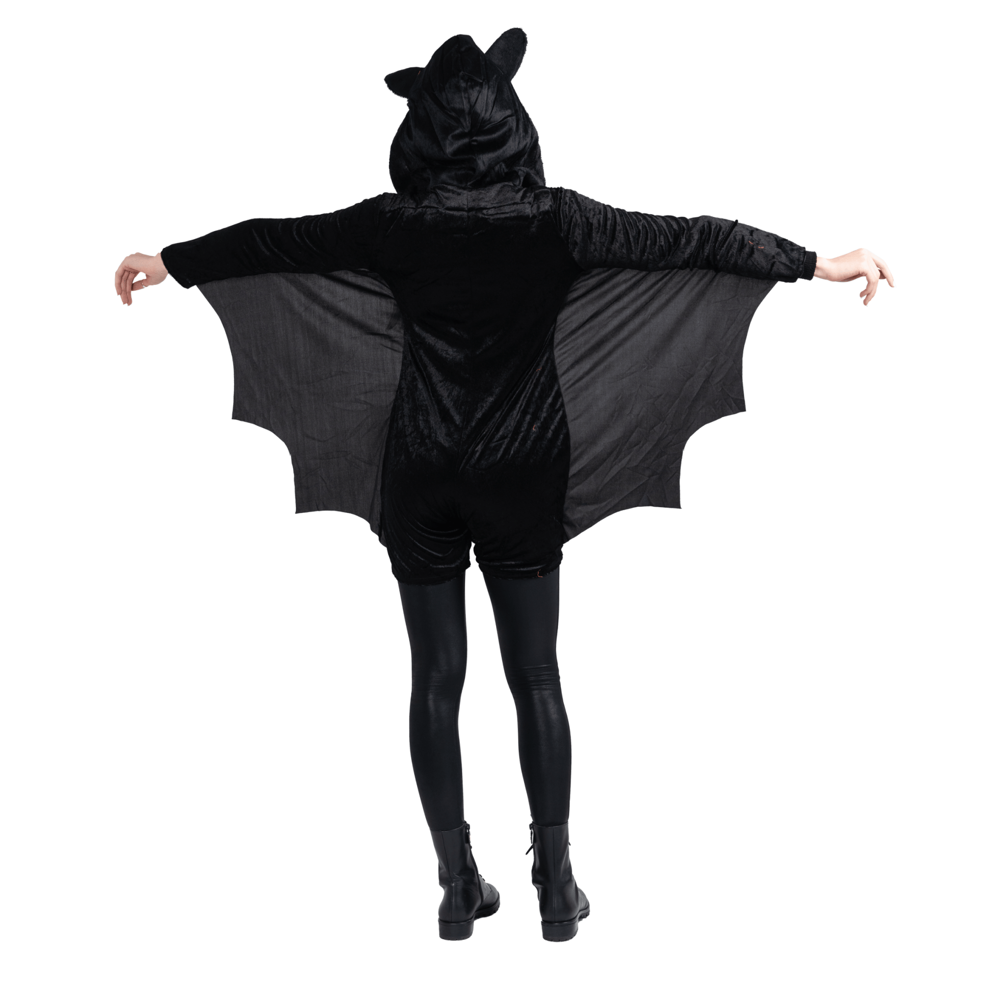 THIS COSTUME WILL REALLY SPOOK EVERYONE AT YOUR PARTY! A great Halloween costume for yourself, friends, family, and kids. The black velour romper features a zippered front for easy on and off. Wings are attached from the back and down the sleeves for the cool bat look. The attached hood has adorable bat ears to complete the bat look.