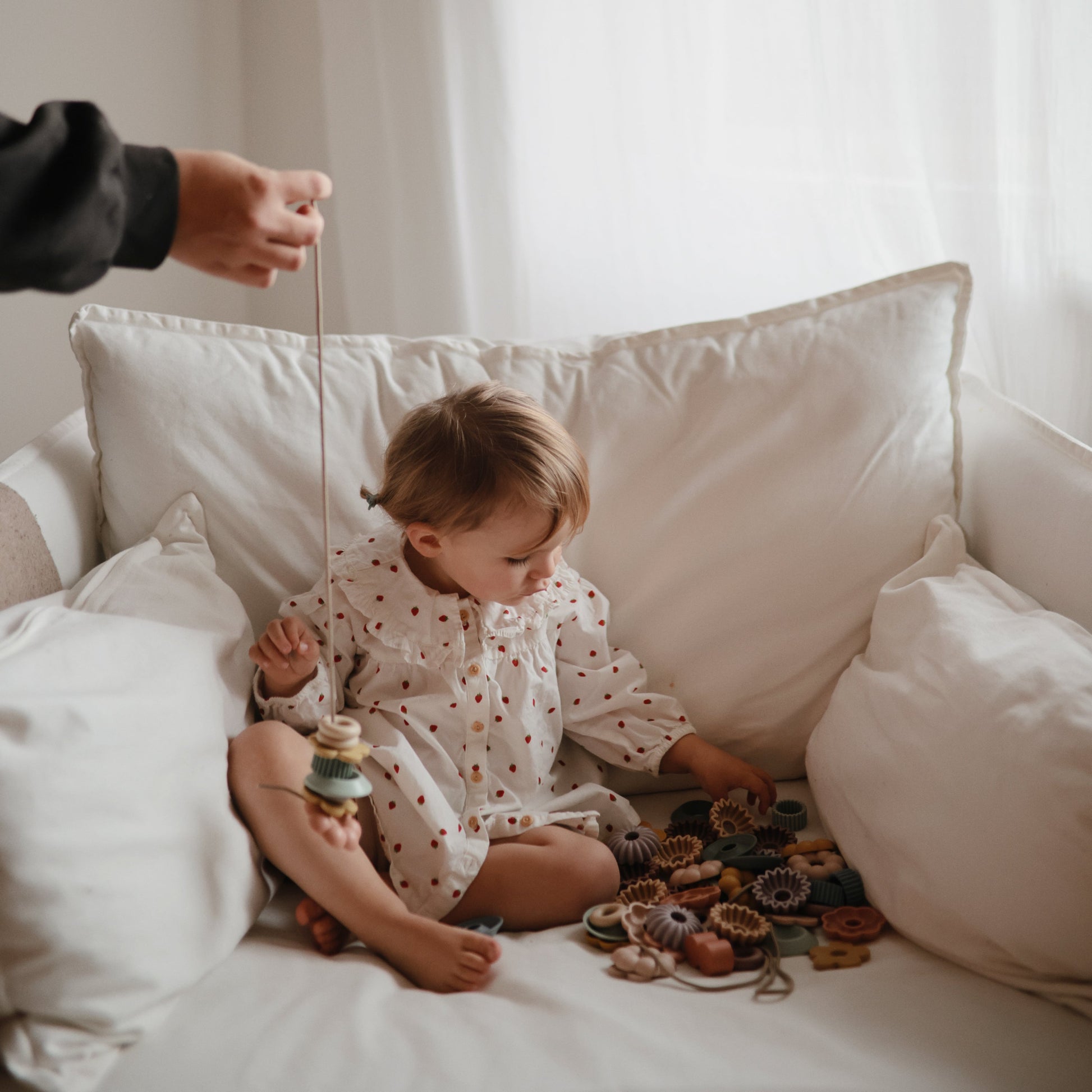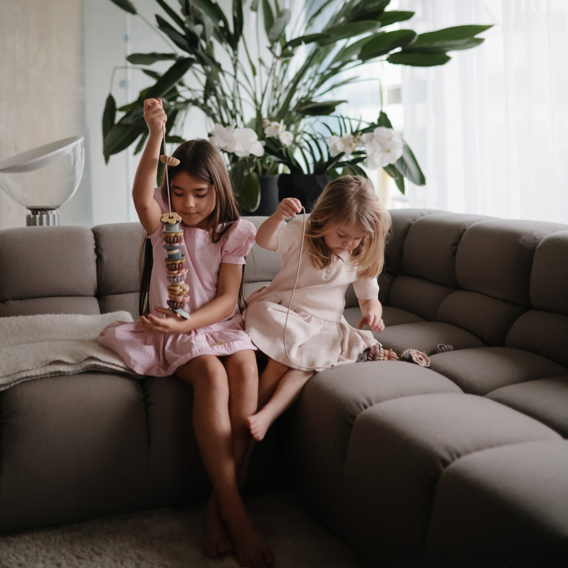 Spark creativity and fine motor skill development with our lacing bead set, thoughtfully designed for endless fun and learning. Crafted from durable, child-safe PP plastic, this set includes 54 beads in a sophisticated palette of muted colors. A timeless toy that can evolve with growing children. Start younger kids with fewer beads to practice lacing, and later introduce the rest to create more complex patterns and develop counting skills. Four strings make it easy for little hands to thread, tie, and design their own unique creations. The set conveniently tidies up into the included storage container, keeping everything organized for next time.