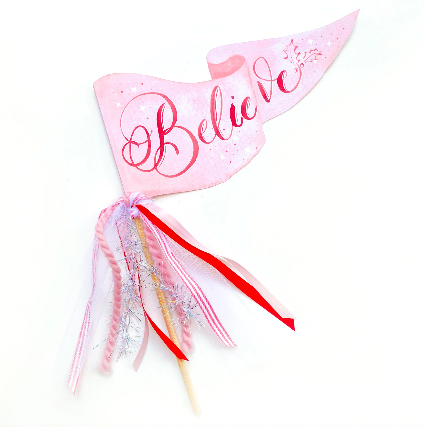 Party Pennants are so fun for celebration props. The Believe party pennant is perfect for celebrating Christmas and the holiday season with a bit of sparkle and whimsy. The tulle embellishment gives this cute party decor piece a "Nutcracker" ballet feel, and it's sure to bring cheer and delight!