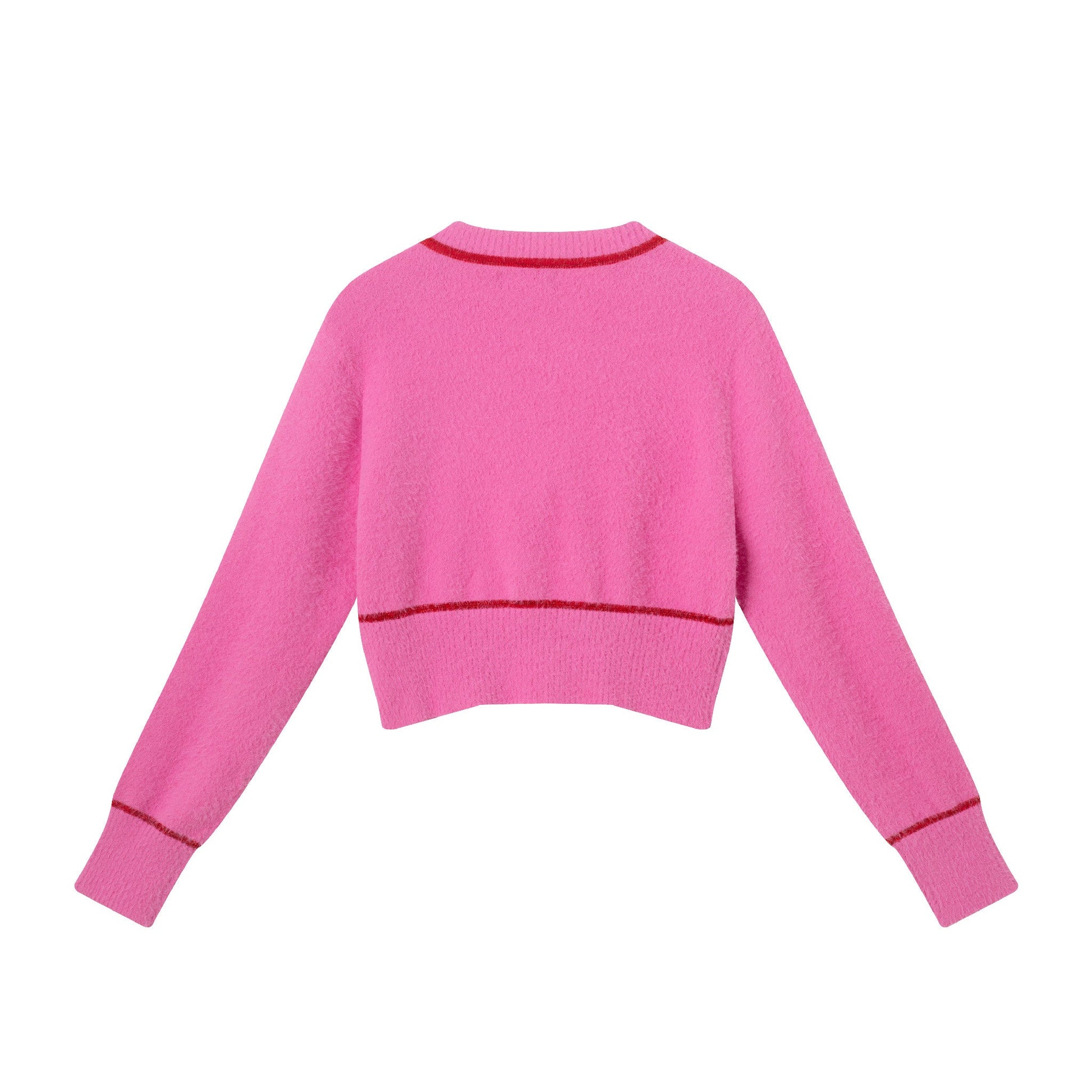 💗 Sweet and stylish, this cropped pink cardigan features contrast red trim and a statement glittery bow tie at the neckline. It’s the perfect layer for dressing up denim, skirts, or holiday looks—cozy and cute all at once.
