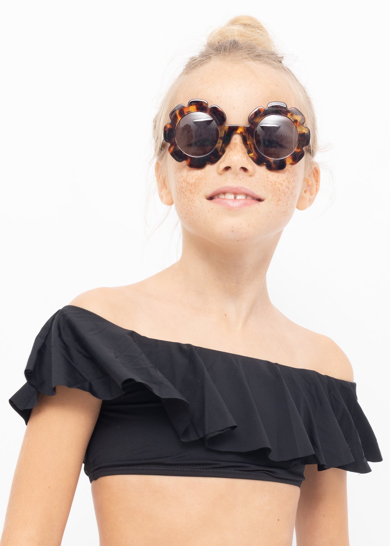 Black bikini for girls in buttery soft black fabric in a best selling cut with matching cover-ups looks great with these goggles as well as the tortoise sunglasses for girls.
