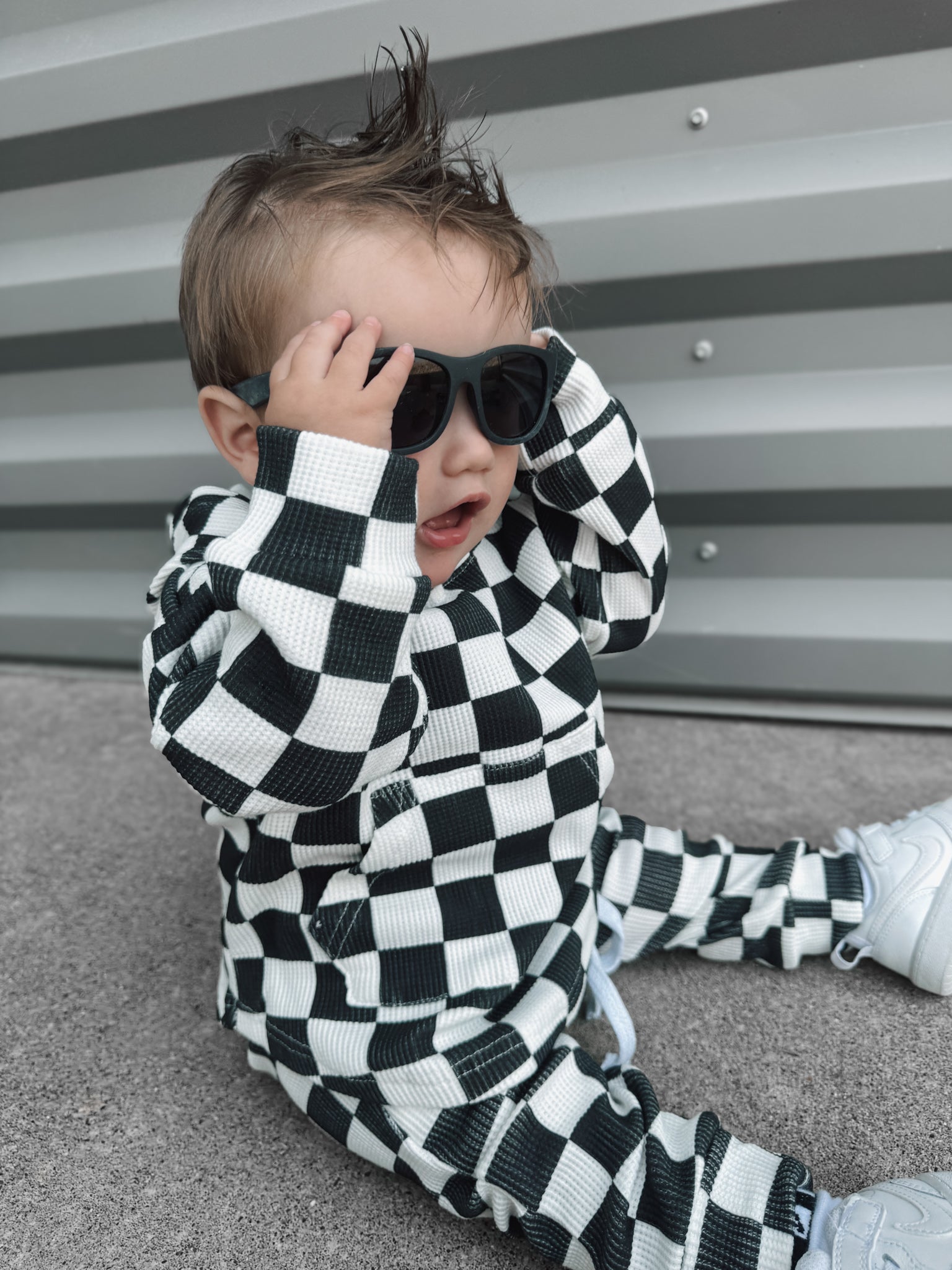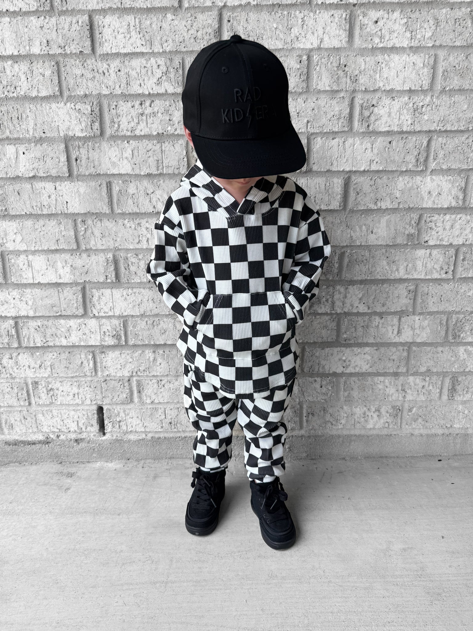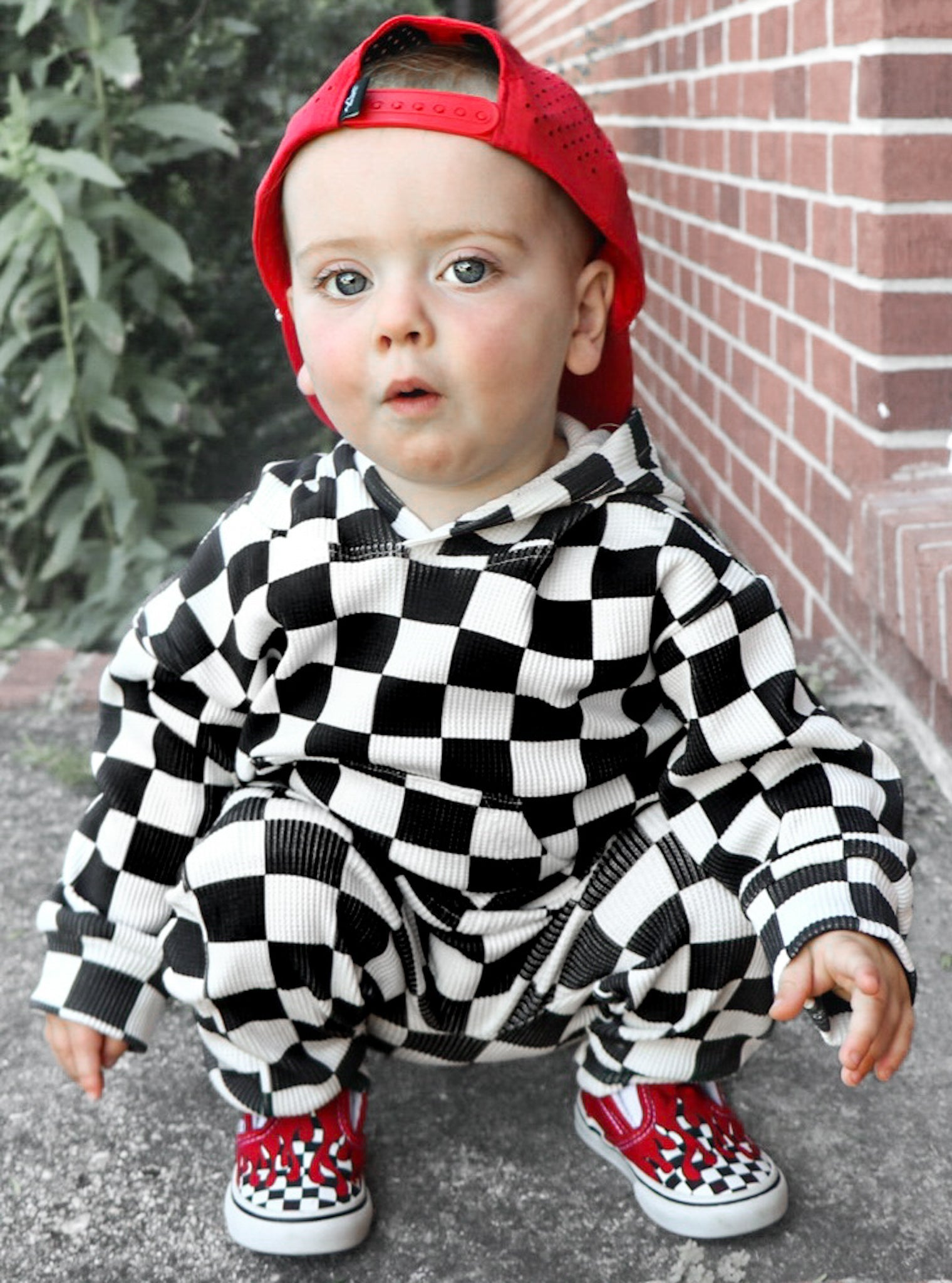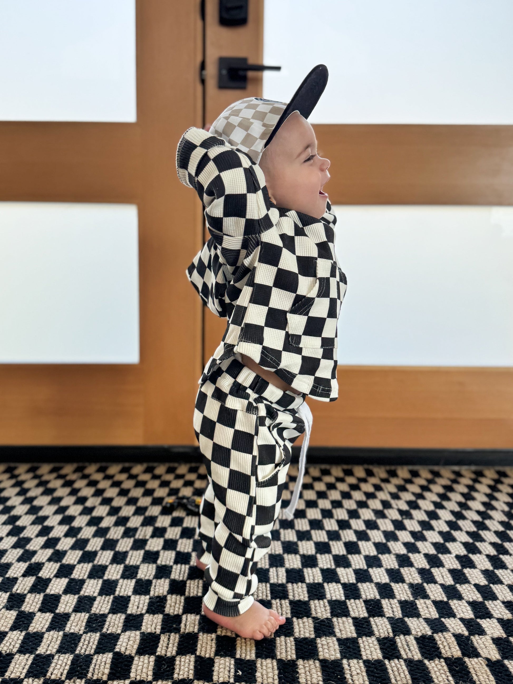 Classic, cool, and made to move — this black and white checkered waffle set brings the heat to everyday fits. Crafted with soft, stretchy waffle knit fabric, it’s comfy enough for playtime and bold enough for street-style snaps.