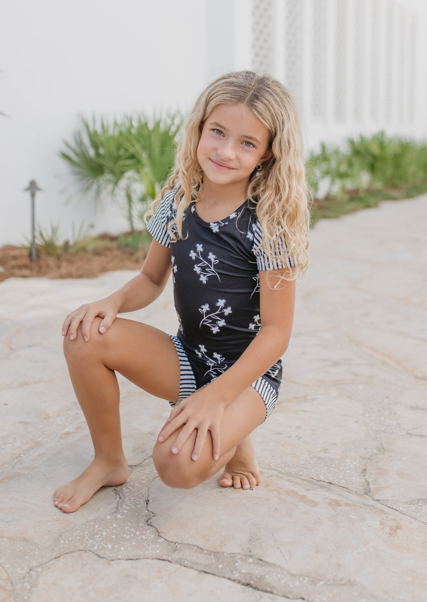 Get ready to dance, tumble, and do gymnastics in style with this Leo Luvs Black Floral Leotard! Featuring a playful black and white striped flower print and cute back details, this shortie leotard is perfect for having fun and standing out.