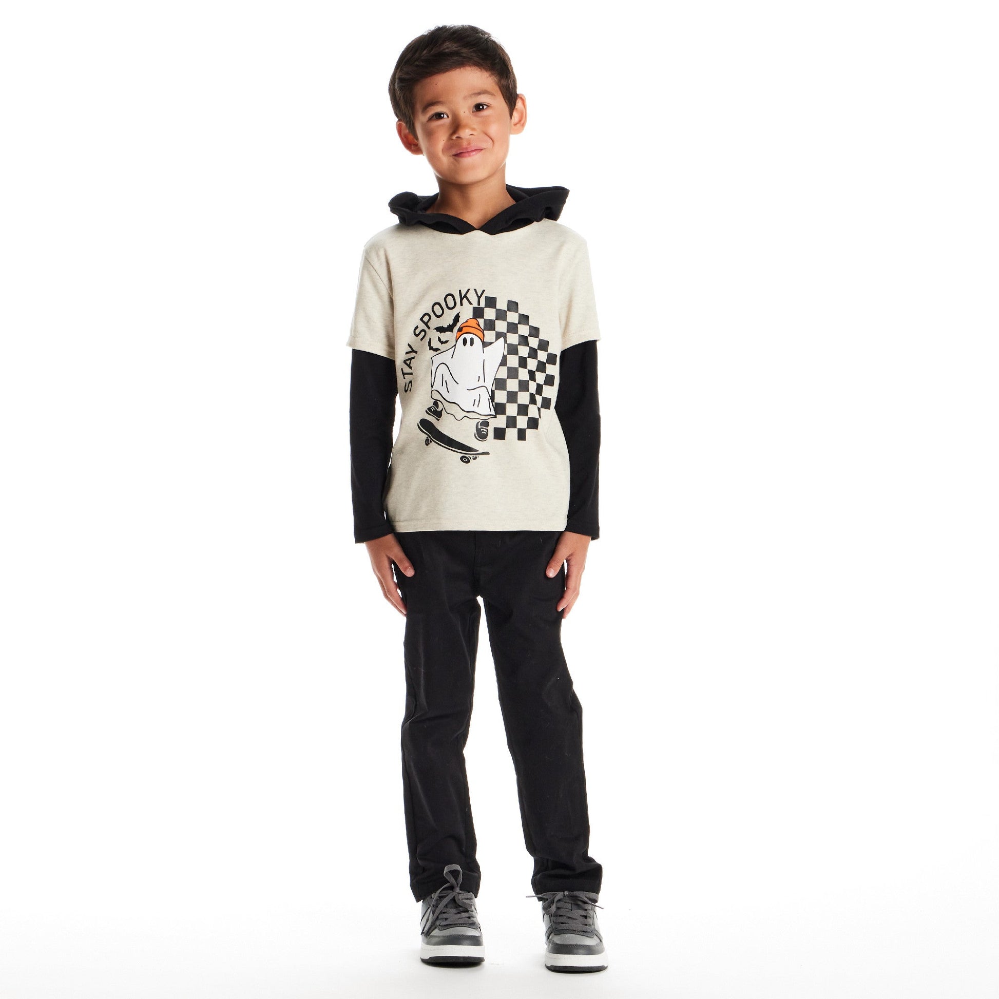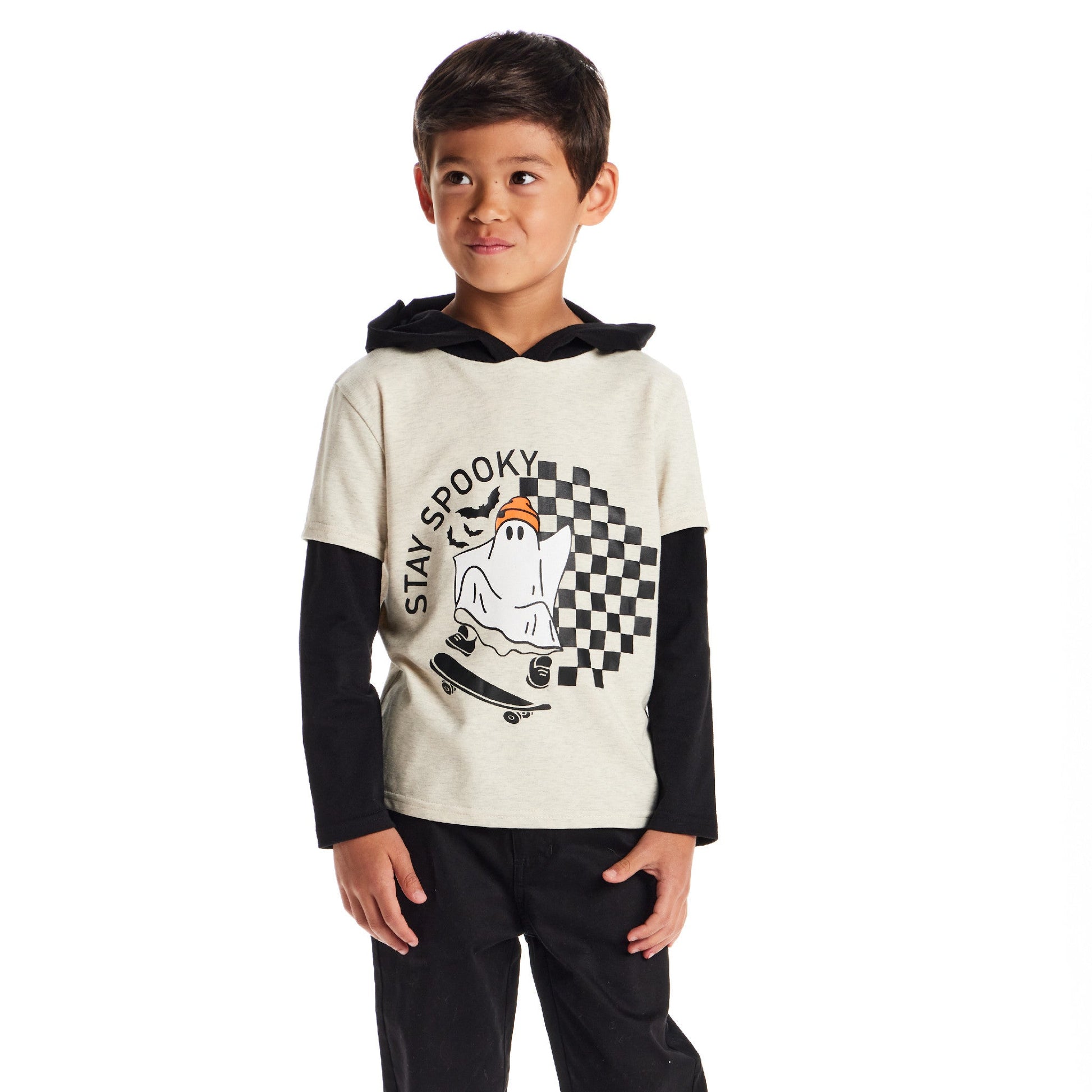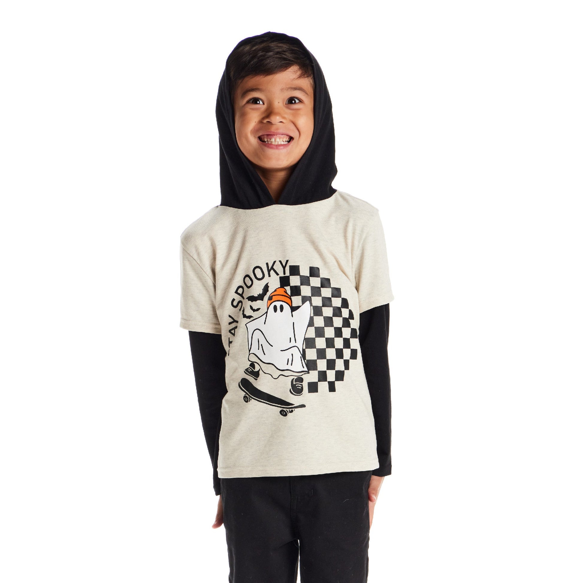 Skate into spooky season in style! This two-fer tee features a ghost on a skateboard, checkerboard graphics, and the motto “Stay Spooky” for a look that’s all treats, no tricks. With a layered long-sleeve hoodie design, it’s perfect for cool fall days, haunted house hopping, or costume-free classroom fun.