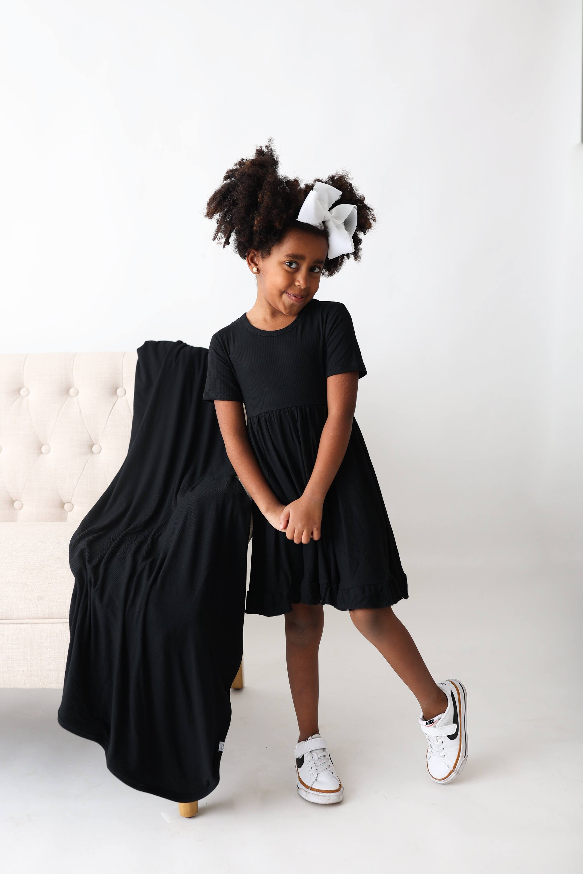 Get ready to twirl in our Black Rib Dream Ruffle Dress! Made from bamboo material, this short sleeve dress is perfect for year-round wear. The fun ruffled design and great neutral color make it a playful addition to any wardrobe. Don't miss out on this must-have dress for girls!