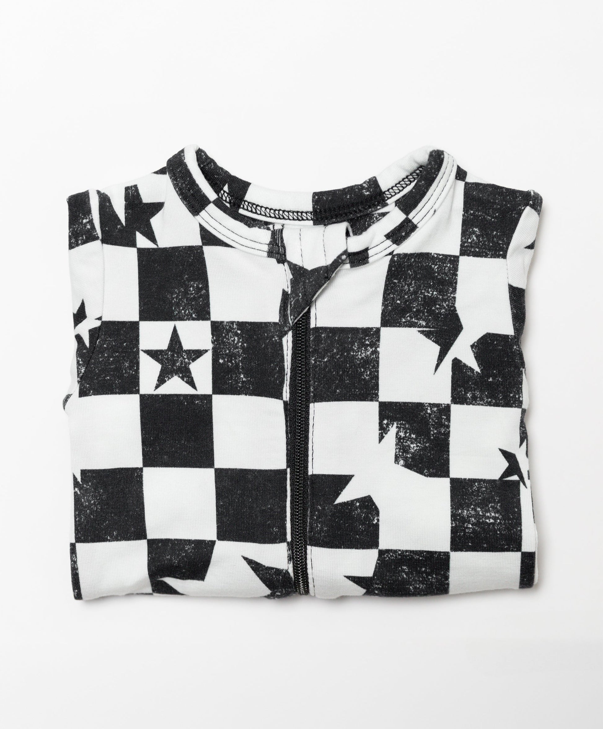 A timeless classic with a bold, modern edge. The Black & White Checkered Star print takes the iconic checkerboard pattern and gives it a playful, starry twist. Crisp black and white with a distressed, worn-in look, this LUXIE® is both nostalgic and effortlessly cool. Made from our signature Bamboo + Pima Cotton blend, it’s the ultimate mix of softness and breathability. With mitten and footie cuffs for a cozy fit and a two-way zipper for easy changes, this set is a must-have for your little rockstar.