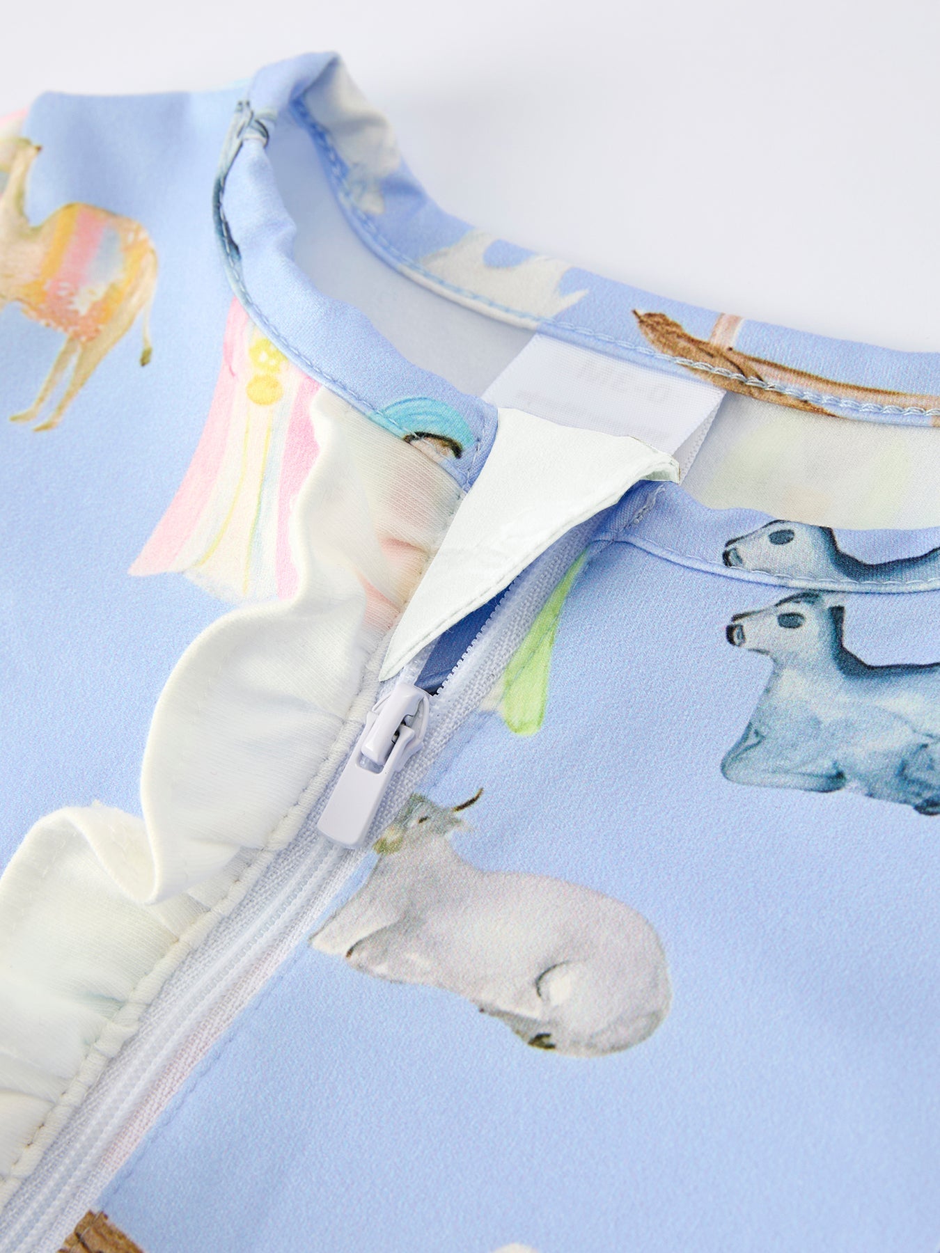 Dress your little one in festive charm with this Blue Christmas Nativity Pattern Baby Girls Romper. Featuring delicate ruffles and a joyful nativity print, it combines comfort with holiday spirit. Soft fabric ensures gentle wear for sensitive skin, making it perfect for cozy winter celebrations and capturing precious holiday memories.