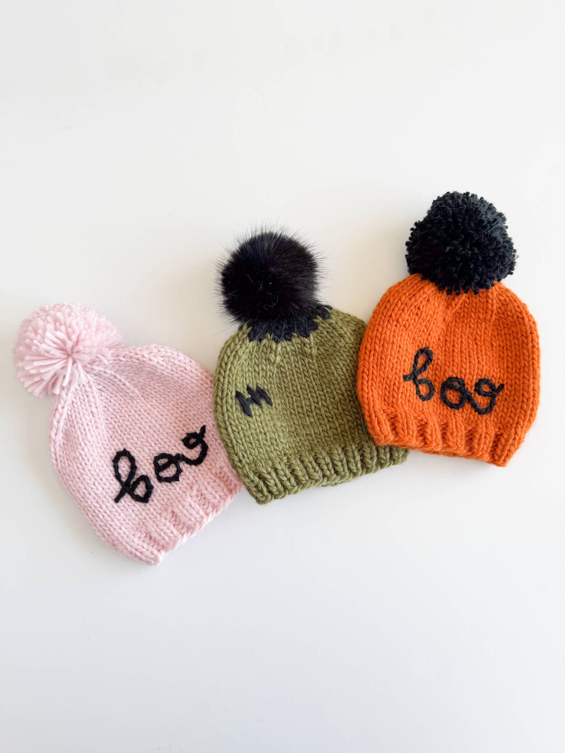 Get ready for the spooky season with this hat. It features a hand-embroidered "BOO" and a fun yarn pom. Check out other colors to match with a sibling or friend.