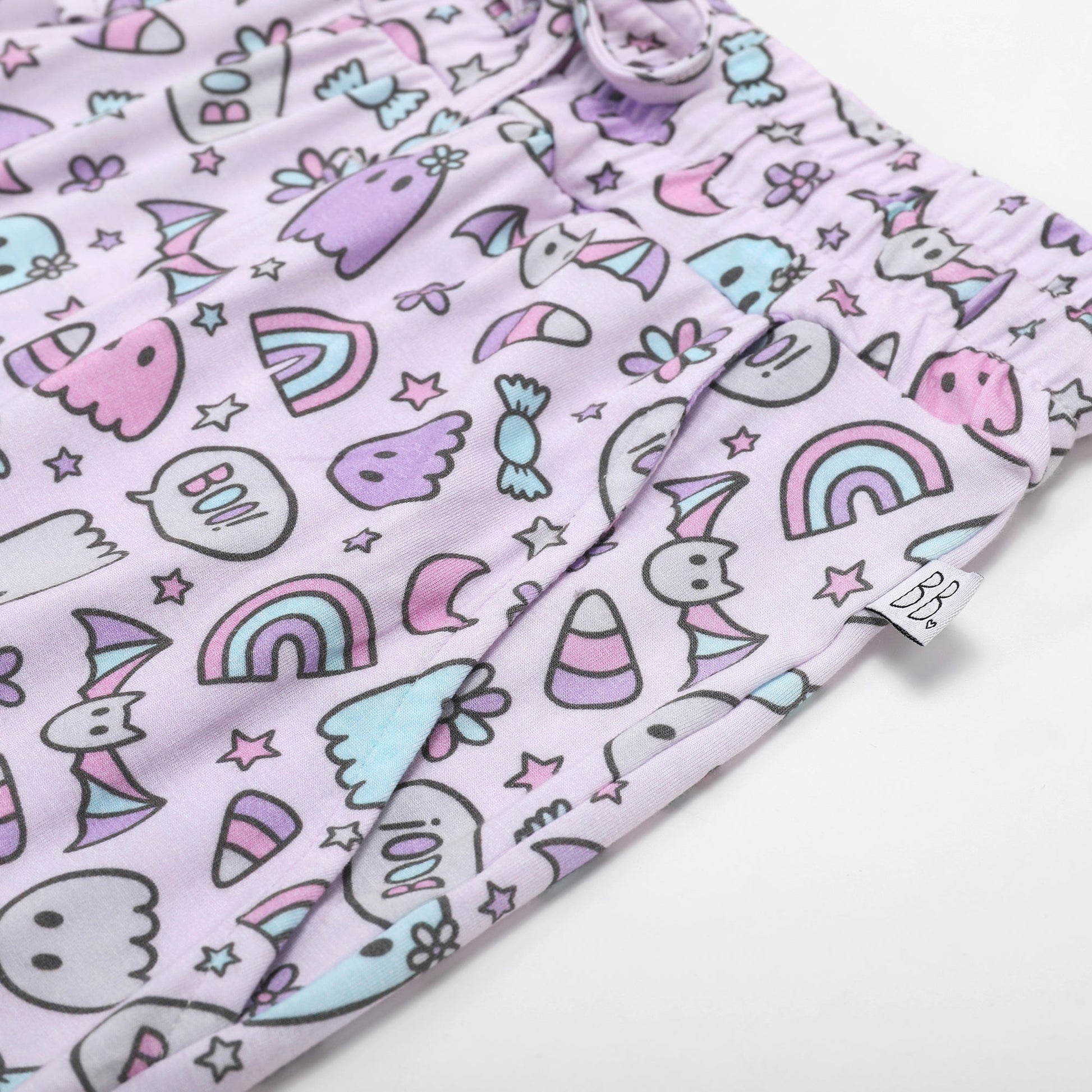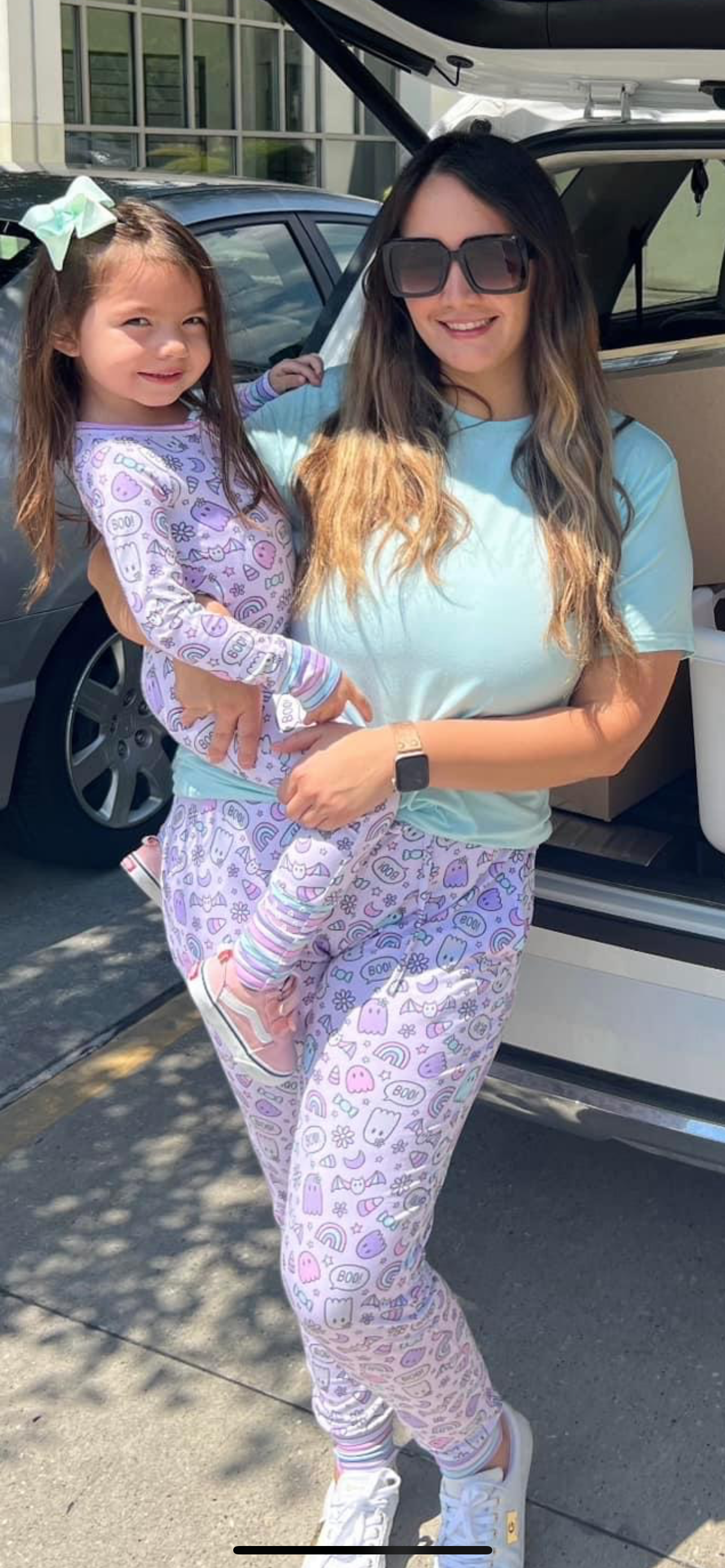Just in time for Halloween, these matching mama joggers with a tie-string elastic band bring a playful and festive touch to your spooky celebrations. Embrace the holiday spirit as you take your little ones trick-or-treating or participate in Halloween-themed activities. Also feature convenient pockets to stash your Halloween candy!