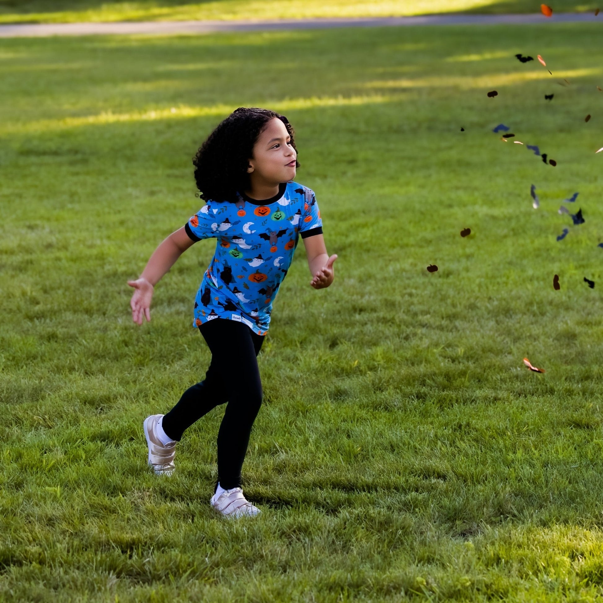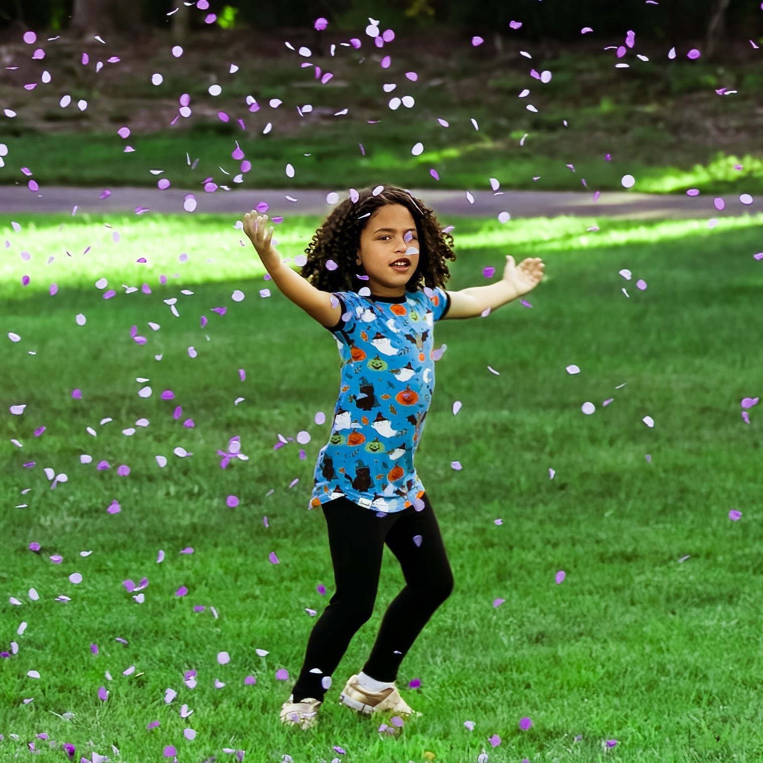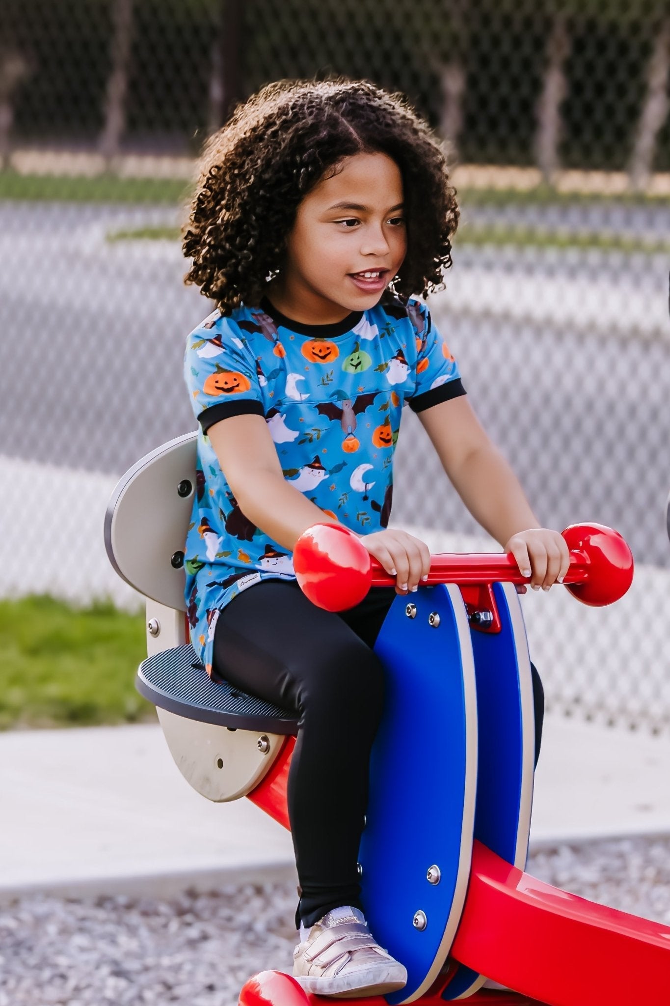 Dress your little one up for Halloween in the Boo! Short Sleeve Tunic, made from 95% organic bamboo and 5% spandex. Offering a sustainable, comfortable, and stretchy fabric, this tunic will be the perfect canvas for your child's imagination. Adorned with playful Halloween prints, they'll be ready for a season full of delightful tricks and treats.