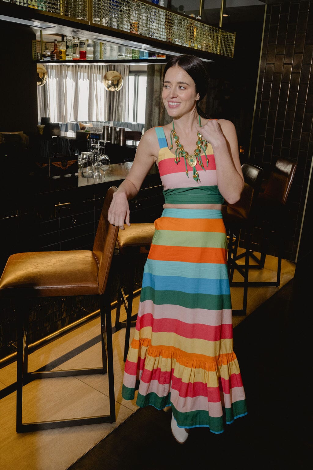Get ready to turn heads in the playful and vibrant Brianna Skirt! This colorful sun striped maxi skirt adds a fun and unique twist to your wardrobe. Perfect for those sunny days when you want to make a statement. Pair with the Brianna Top for the perfect look.