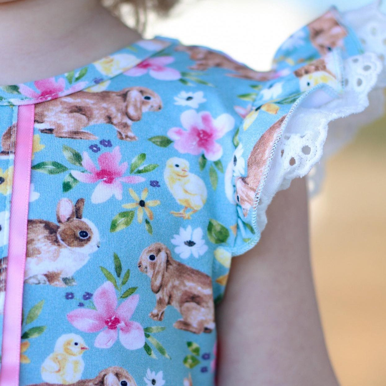 Cotton knit 4 way stretch twirl dress with double ruffle, full twirlability! Eyelet lace trim on dress skirt and the flutter sleeves.