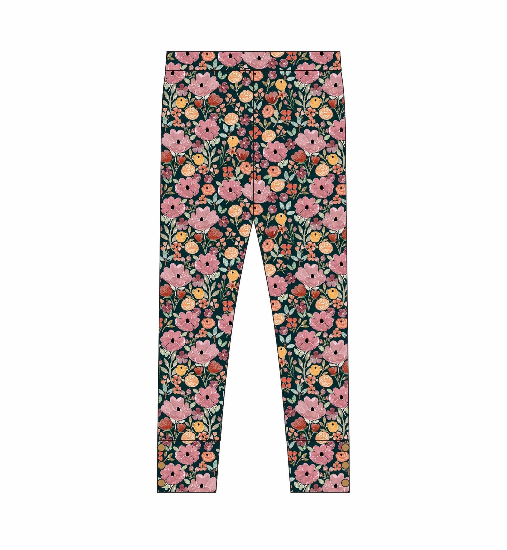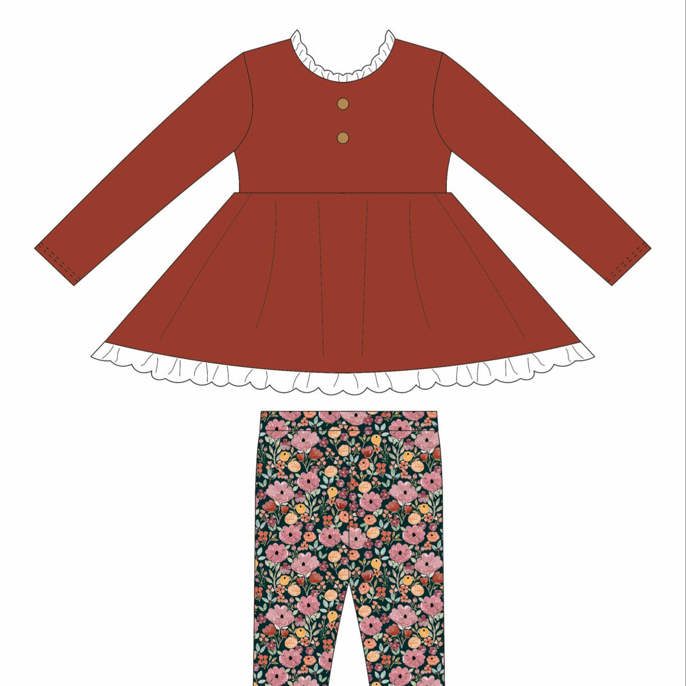 Tunic length, ribbed cotton tunic and leggings. Long or short sleeves options. The floral leggings have burnt orange, mauve, mustard, greens on a dark background.