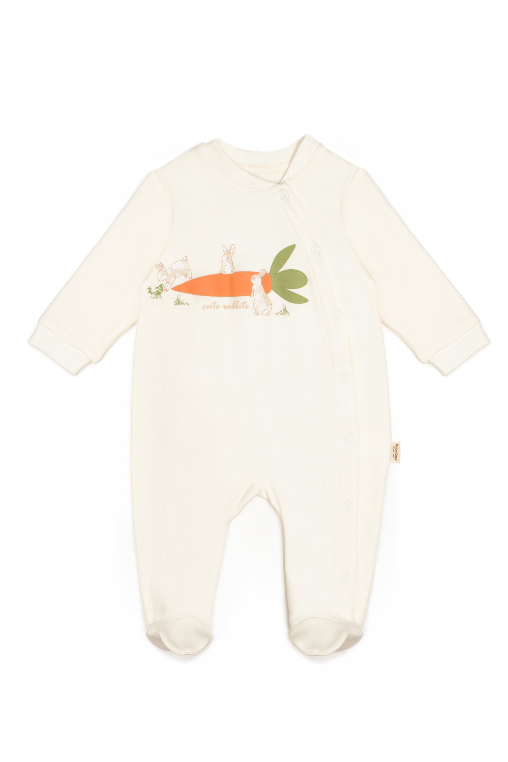 Featuring an adorable carrot print on a soft green background, this onesie adds a playful touch to your baby's wardrobe. The footed design keeps tiny toes warm and secure, ensuring your little one stays comfy during all their adventures.