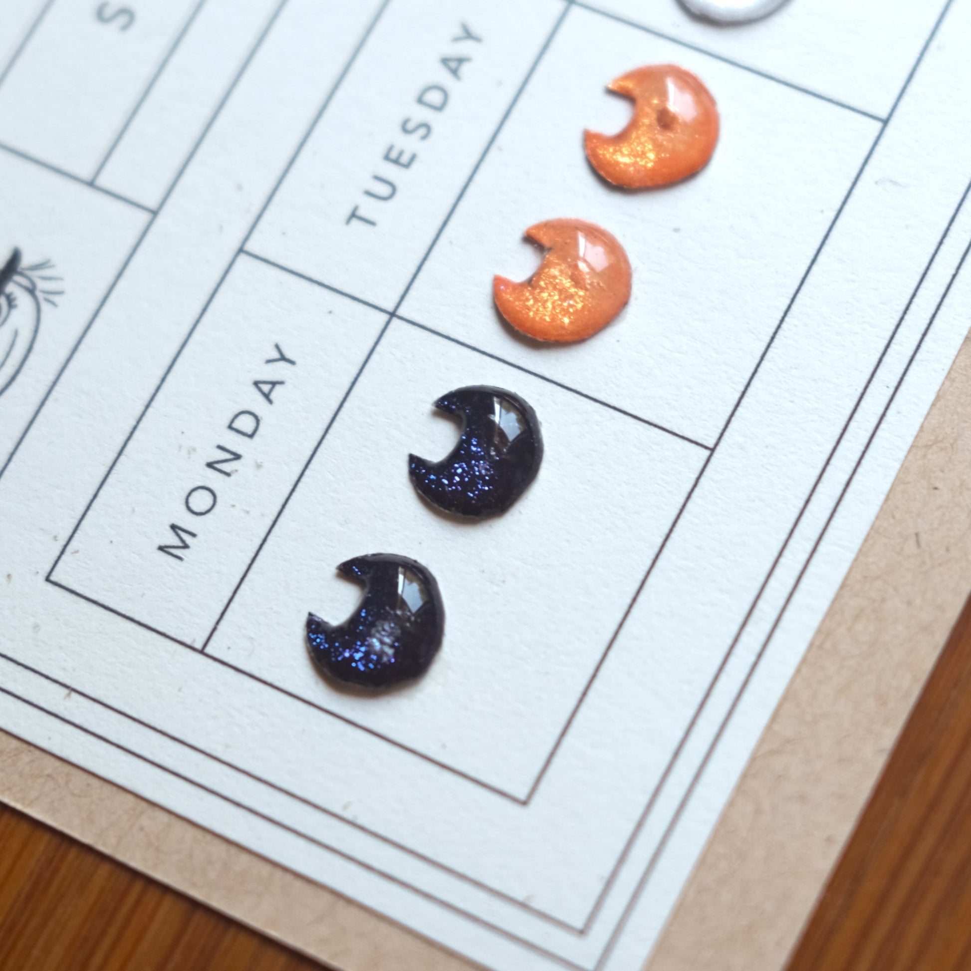 A flash back to the past, this Cat Club Stick-On Earring Set features a new color for each day of the week! Stick-on earrings are metallic-holographic and shimmer in the light. Just peel and stick! They stay on up to 24 hours. Since each item is handmade, please allow slight differences between orders. Earrings are about 7mm in circumference.