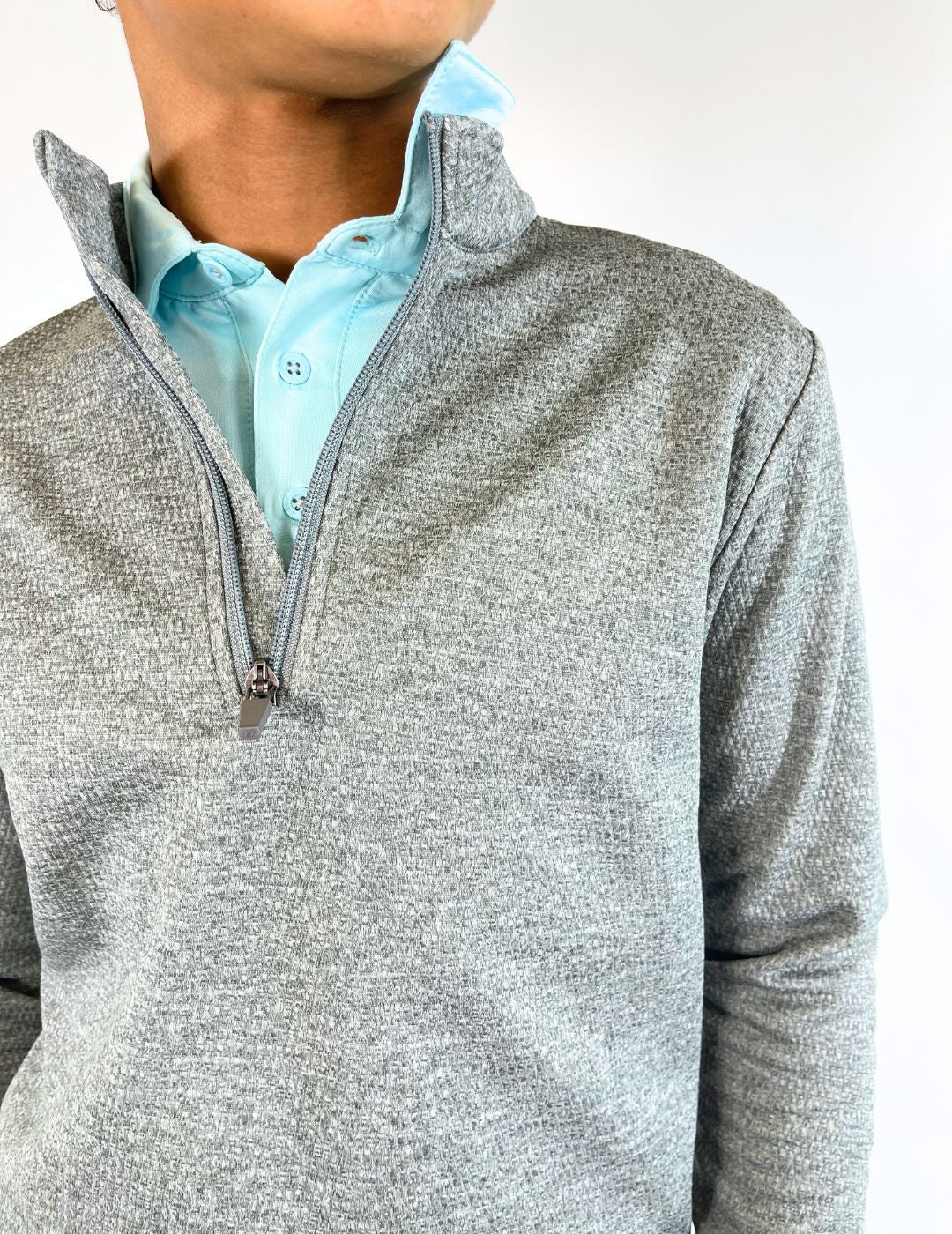 Elevate your youth boy's wardrobe with Chase – the Heathered Honeycomb Layer Quarter Zip Pullover that combines flair, flexibility, and sun protection. Order now and watch him conquer every adventure with confidence and style!