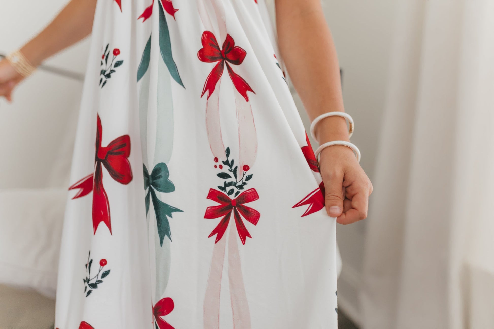 Dress your little one in festive fashion with our Christmas Bow Lounge Gown! This girls' holiday gown features red & white polka dot and coquette bow print, complete with ruffles for added charm. Perfect for cozying up by the fire and opening presents. 'Tis the season to be snug!