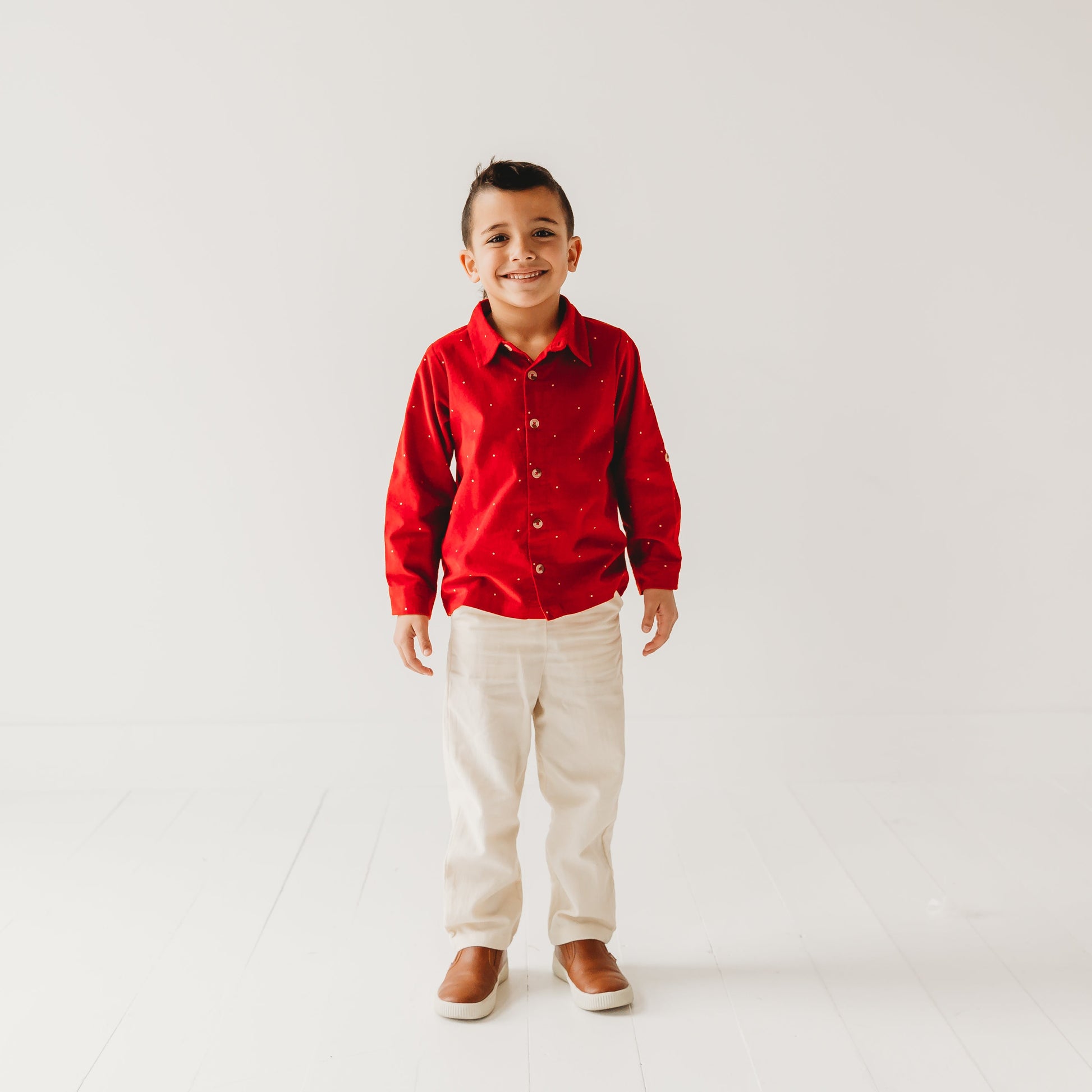 Get your little one in the holiday spirit with this charming red corduroy shirt!
