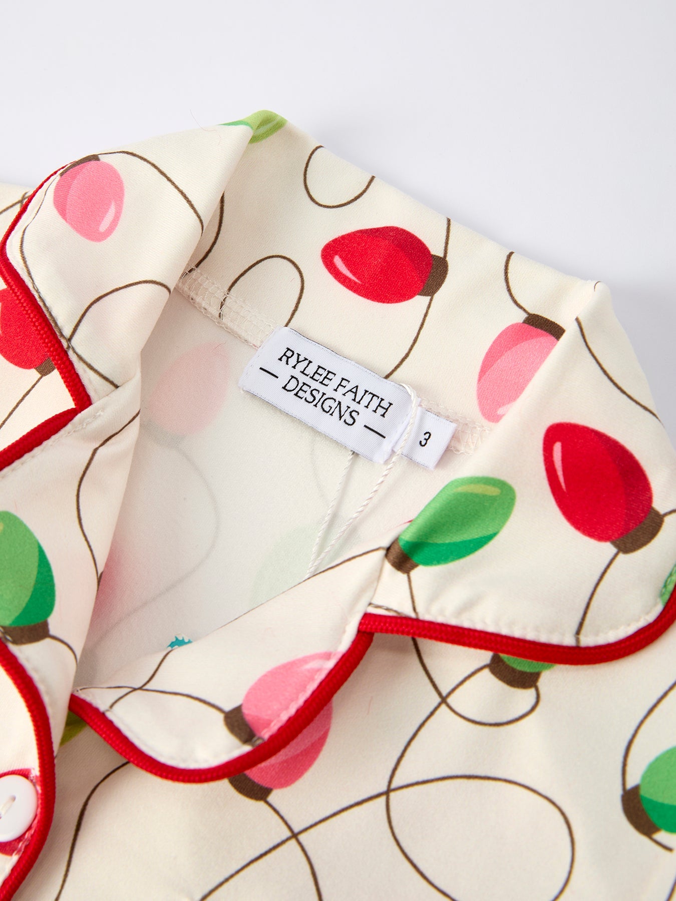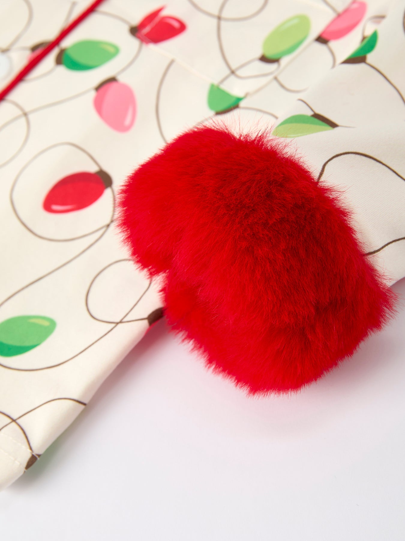 Christmas Lights Print Pajamas Set with Red Furry Trim – Kids Long Sleeve Top and Pants