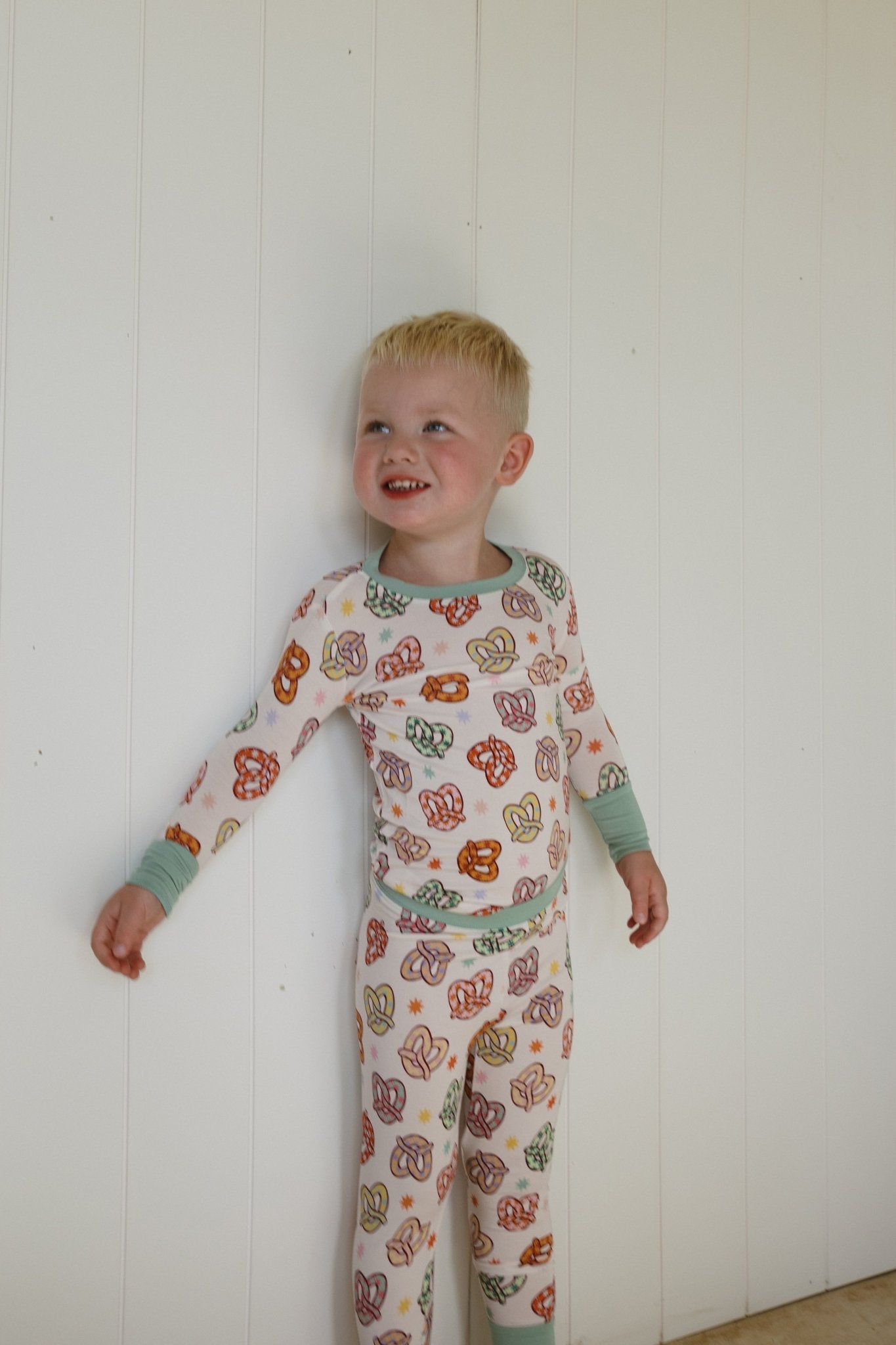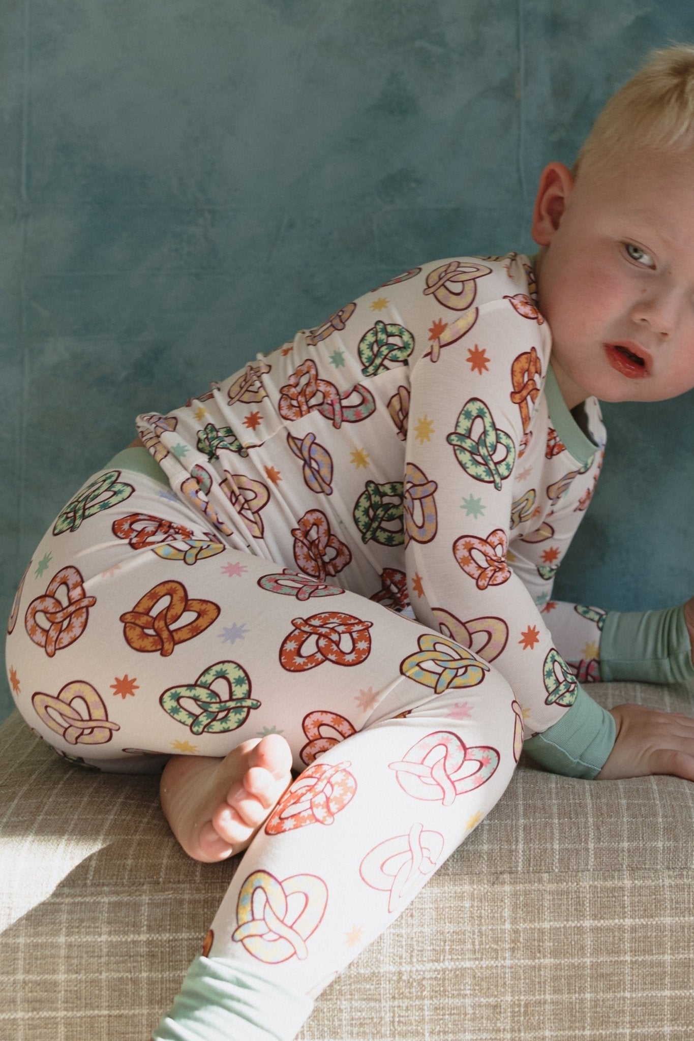 Our Colorful Pretzel Two-Piece Bamboo Pajama Set are made for snack time, slow starts, and everything in between. Featuring our bright and playful pretzel print, this long-sleeve top and matching pants set is crafted from a premium blend of 95% viscose from bamboo and 5% spandex — breathable, buttery-soft, and stretchy for nonstop comfort.