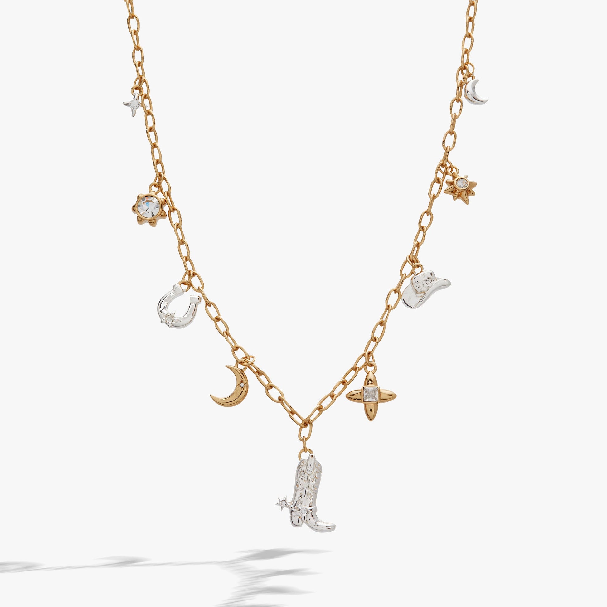 This necklace features a gold-plated cable chain with charming two-tone accents like a cowboy boot, hat, horseshoe, star, sun, and moon. Sparkling clear crystals and celestial etchings add a magical touch. Perfect for celebrating your inner rhinestone cowgirl, it blends western style with a cosmic twist. The versatile two-tone finish makes it easy to mix and match, bringing a playful western vibe to your jewelry collection.