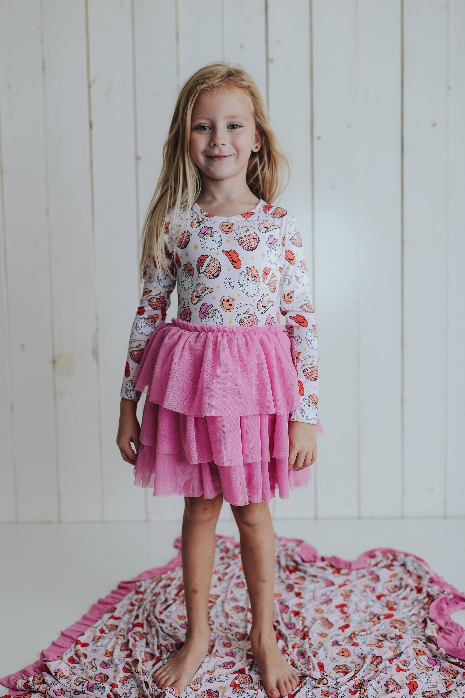 She'll be dreaming of a Howdy Christmas in this adorable tutu dress! Featuring a festive Santa in a cowboy hat and fun Christmas colors, she'll look as cute as a candy cane in this playful outfit! Let her dreams come true this holiday season. Yee-haa!