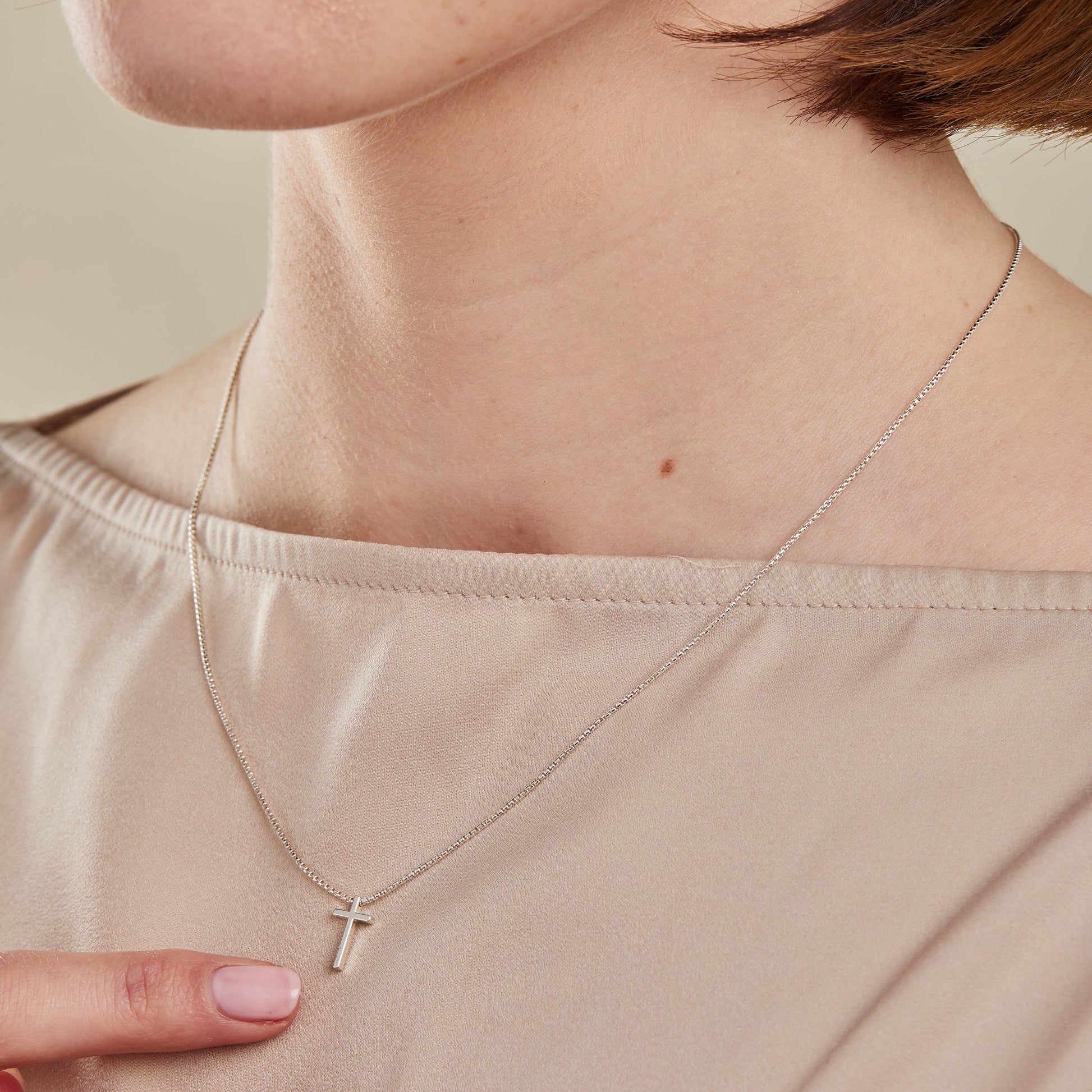 A timeless symbol of faith, this delicate cross necklace is crafted in sterling silver or 14k gold vermeil. The dainty design makes it perfect for everyday wear, layering, or gifting with meaning. Charm size: approx. 0.5" H x 0.3" W. Adjustable 16"–18" chain.
