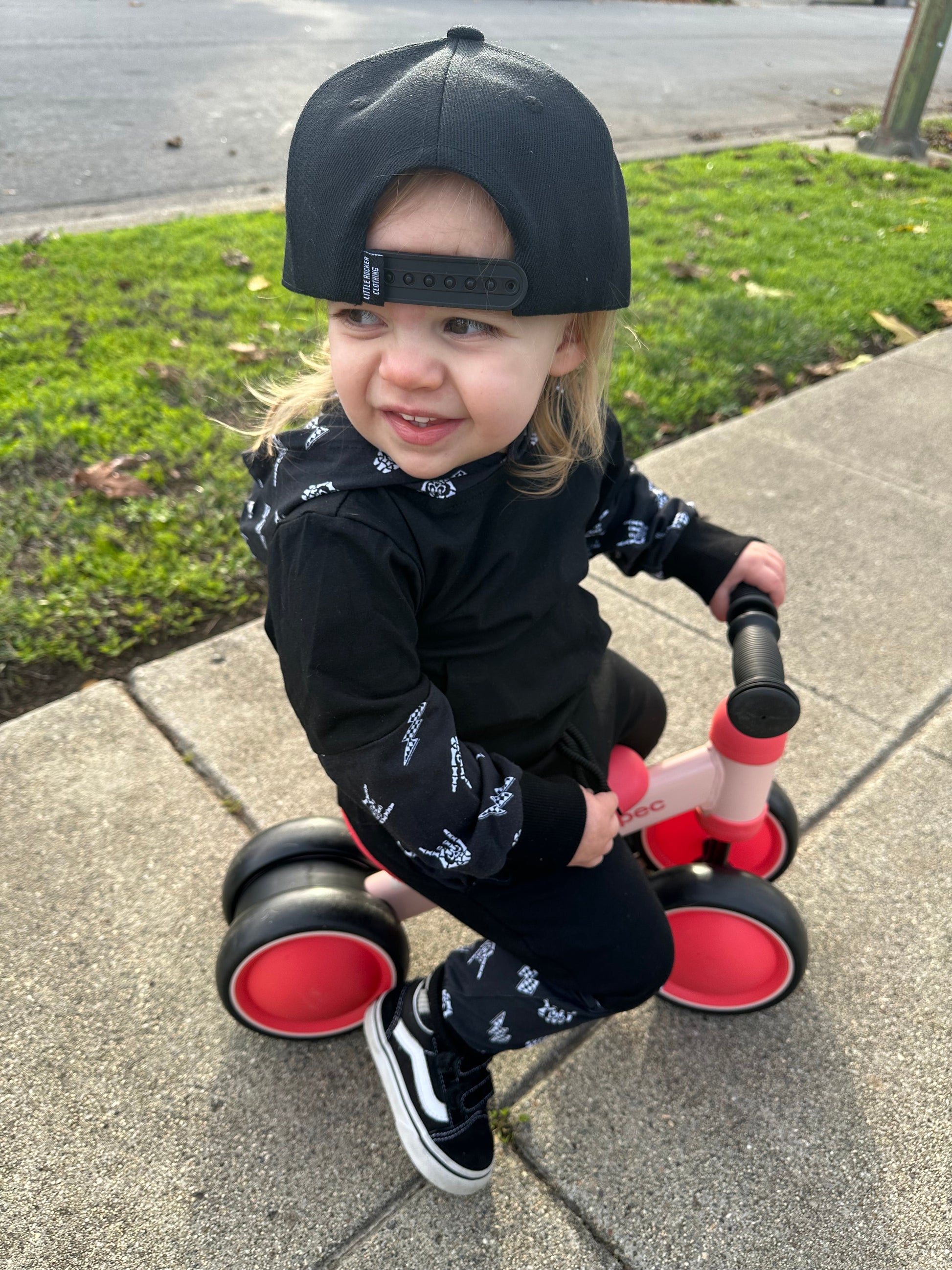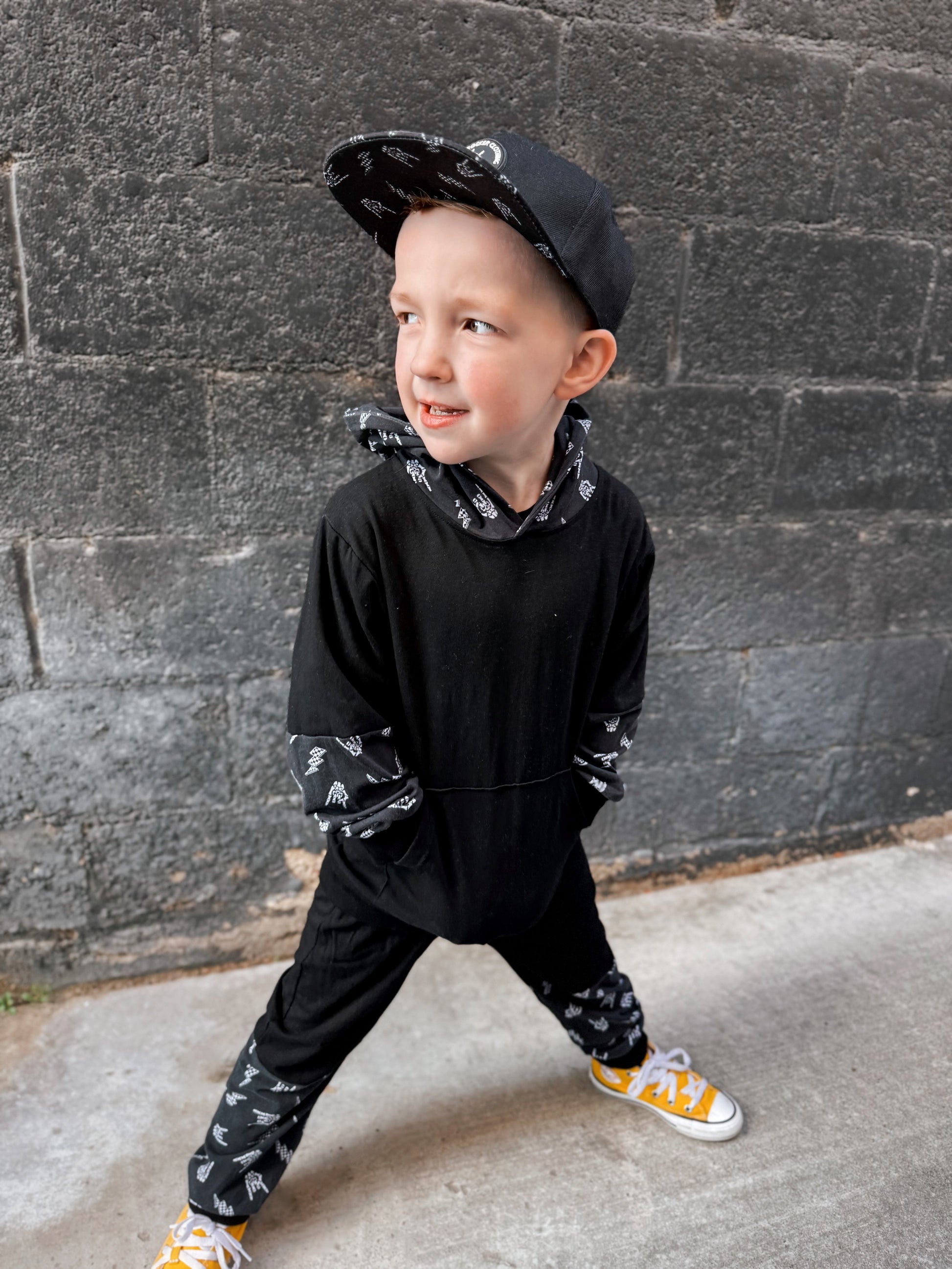 Elevate your style with the Dash Sweatset! Featuring LRC's exclusive bolted bones accents on parts of the legs and sleeves against a sleek black backdrop, this design is bold, unique, and impossible to find anywhere else. Perfect for year-round wear, it’s as practical as it is eye-catching, with front pockets and a cozy hood for ultimate comfort. Whether you’re lounging or turning heads, the Dash Sweatset has you covered!