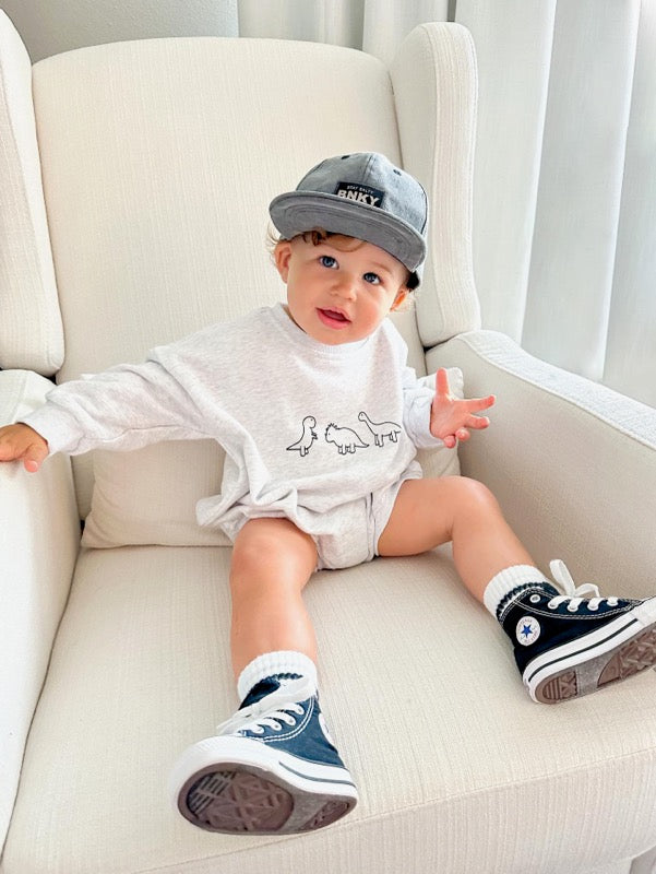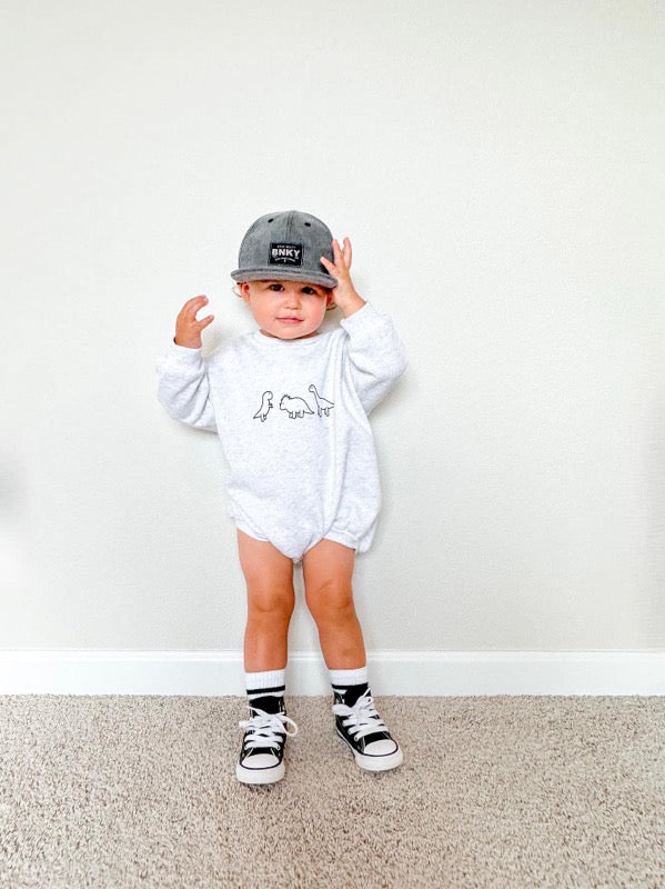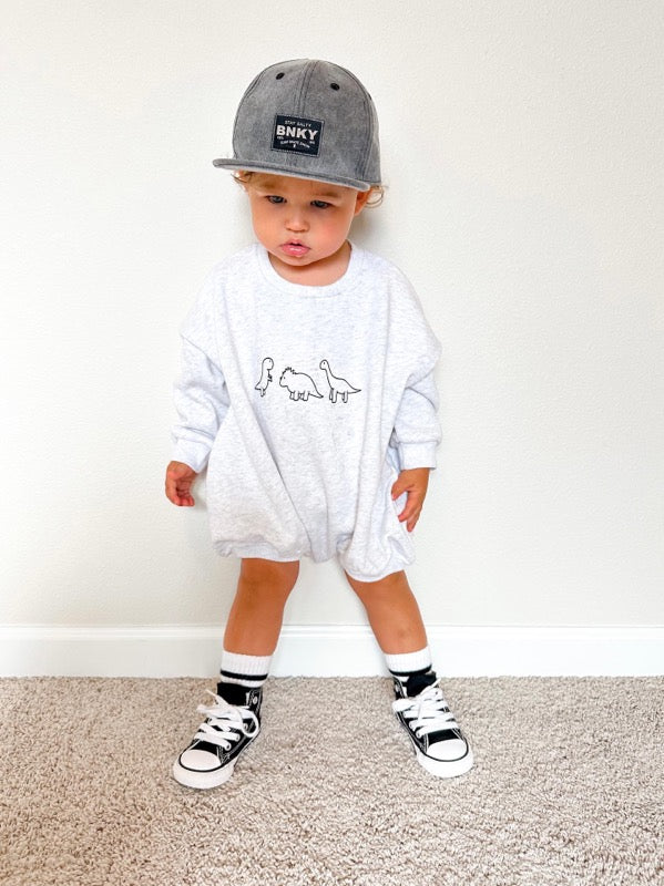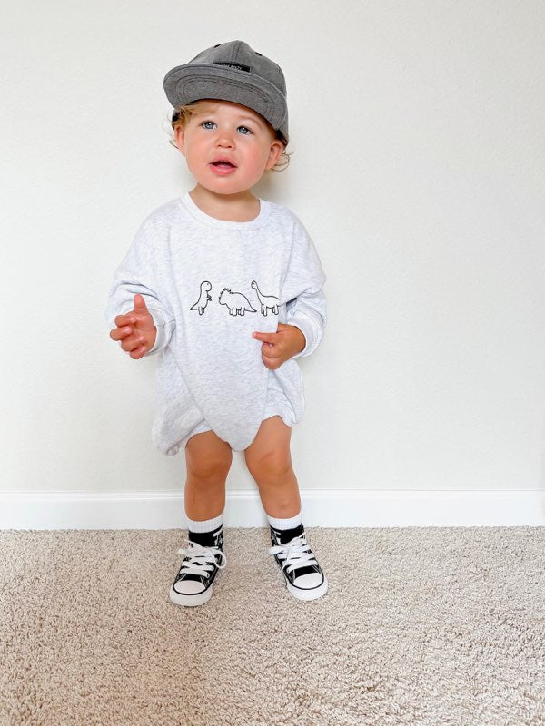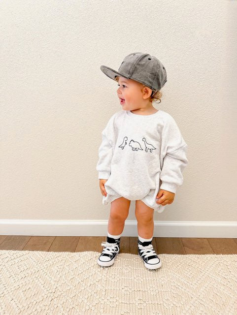 Bubble romper is oversized, and meant to be worn that way. The perfect simple Dino design for your Dino lover! Our first batch is here and ready to go in sizes 6M-24M, our next batch will have 0/6 & 2/3T in the romper and then we will also have crewnecks with our next drop mid September. Our fall bubbles have more of a sweatshirt feel for that extra cozy fit!